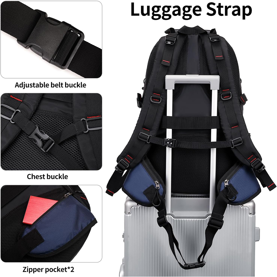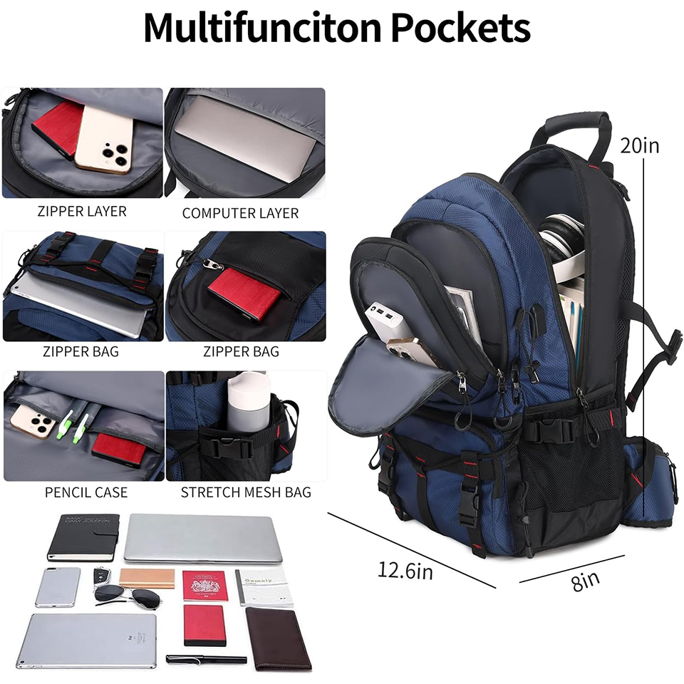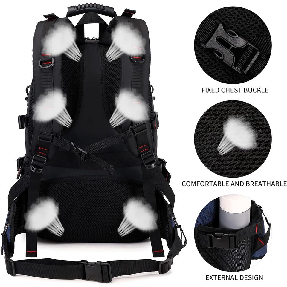 | Feature: | * Large Capacity: With 40L storage space, this backpack features with multi-compartment design includes one main zipped compartment, several front pockets with zippers and two side pockets. Large capacity helps you easily organize all your essential items.