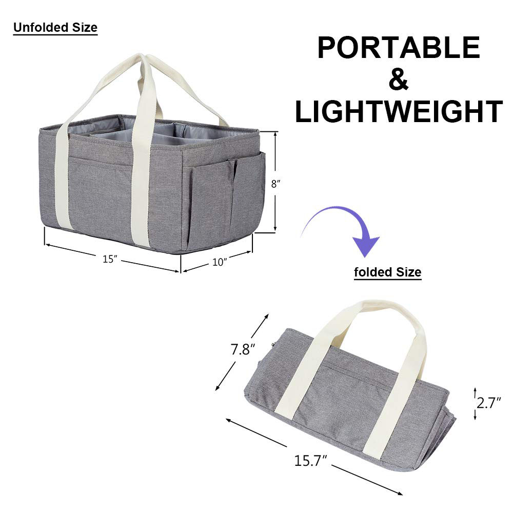 This diaper wipes caddy is made of 600D Polyester material. Not only does this baby bag hold 20 kg but also this fabric is easy to clean with a cloth and snuggly to touch. Nursery storage tote (15 x 10 x 8 inches) can be collapsible, so it is portable and foldable for easy packing and travel.