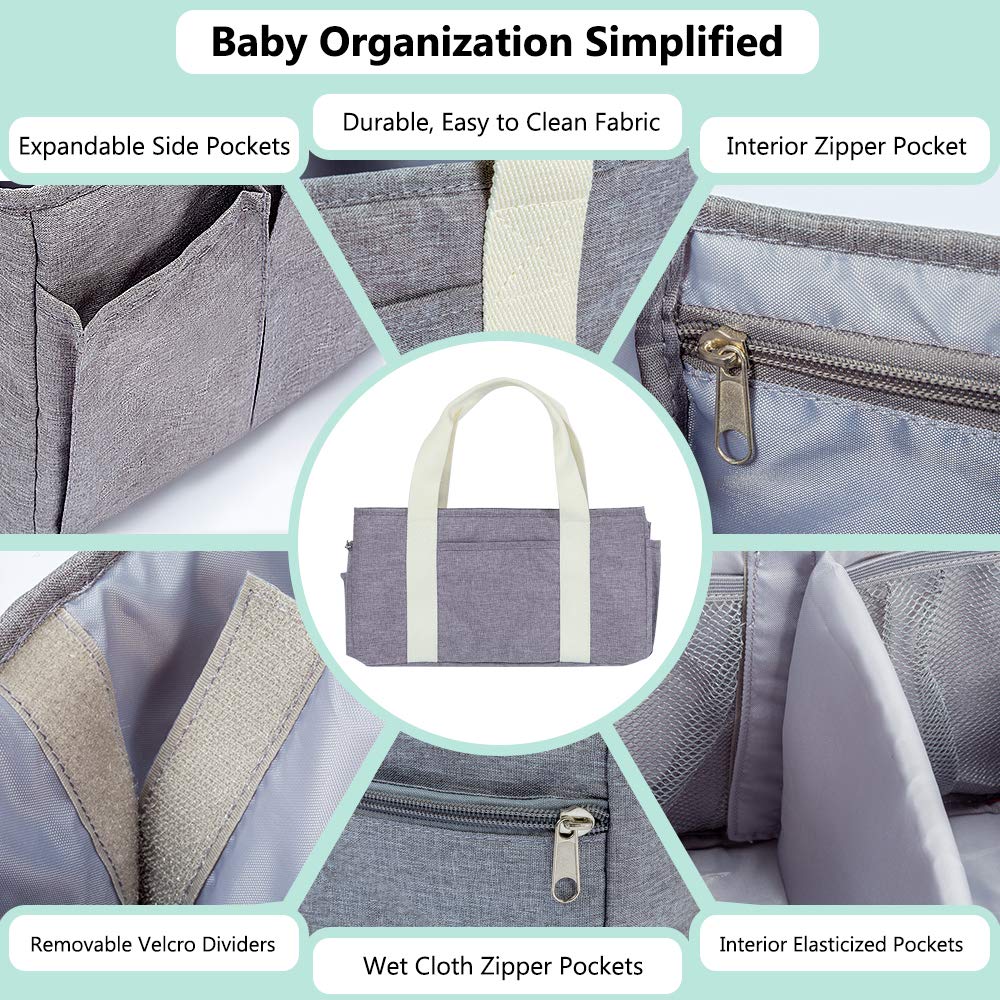 | Feature: | 1.MULTI-POCKETS AND REMOVABLE INSERTS: The storage tote caddy has 6 exterior and 3 interior pockets, which is versatile enough for all baby essentials. Meanwhile, baby storage organizer with 2 removable organizing dividers makes customizable storage easy. The pockets on the outside help with not losing the little things like nail clippers, diaper cream, diapers, and wipes, etc. 2.INSULATED POCKET DESIGN: The storage bag includes a high-quality matching insulated pocket that fits the feeding bottle and helps retain hot or cold temperature for better-tasting milk or drinks. |