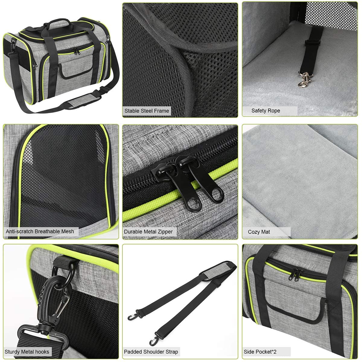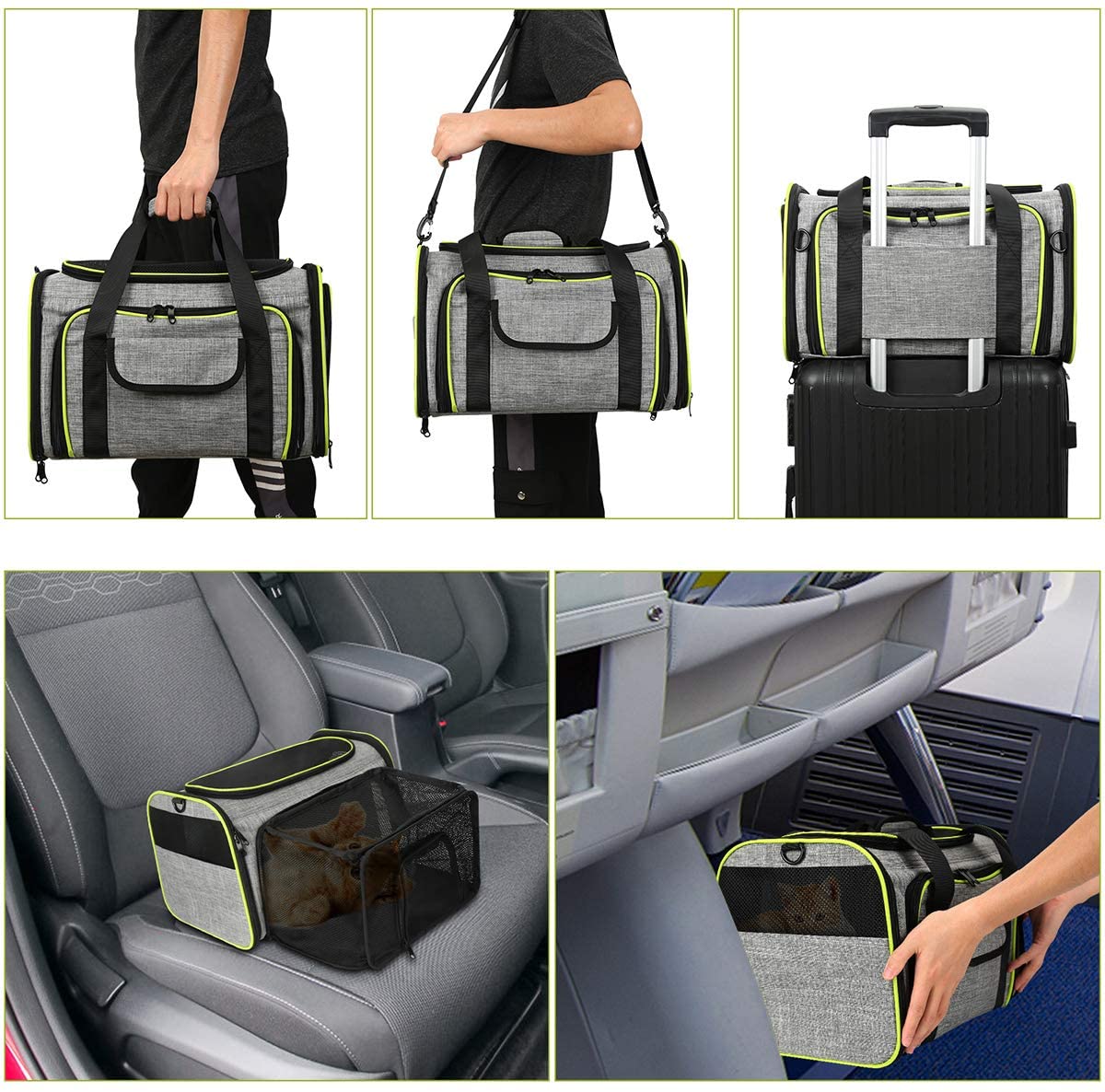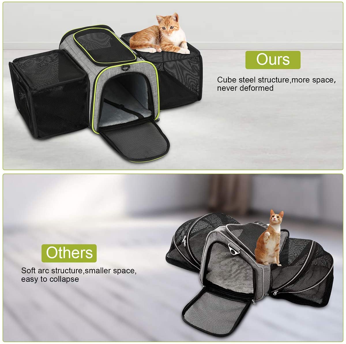 | Feature: | * UNIQUE CUBE EXPANSION: Different from the expandable pet carrier that use arc expansion on the market, we use cube expansion design, which is more sturdy and more practical. The expandable part uses a stable steel frame, can bear load without deformation, provide a safe and comfortable space for your pet. * STURDY STEEL FRAME: Unlike other expandable carriers which clearly sag when you are out with your pets, our carrier (include cube expansion) uses steel frame structure, to prevent it from sagging and keep stable even after fully expanded. |
