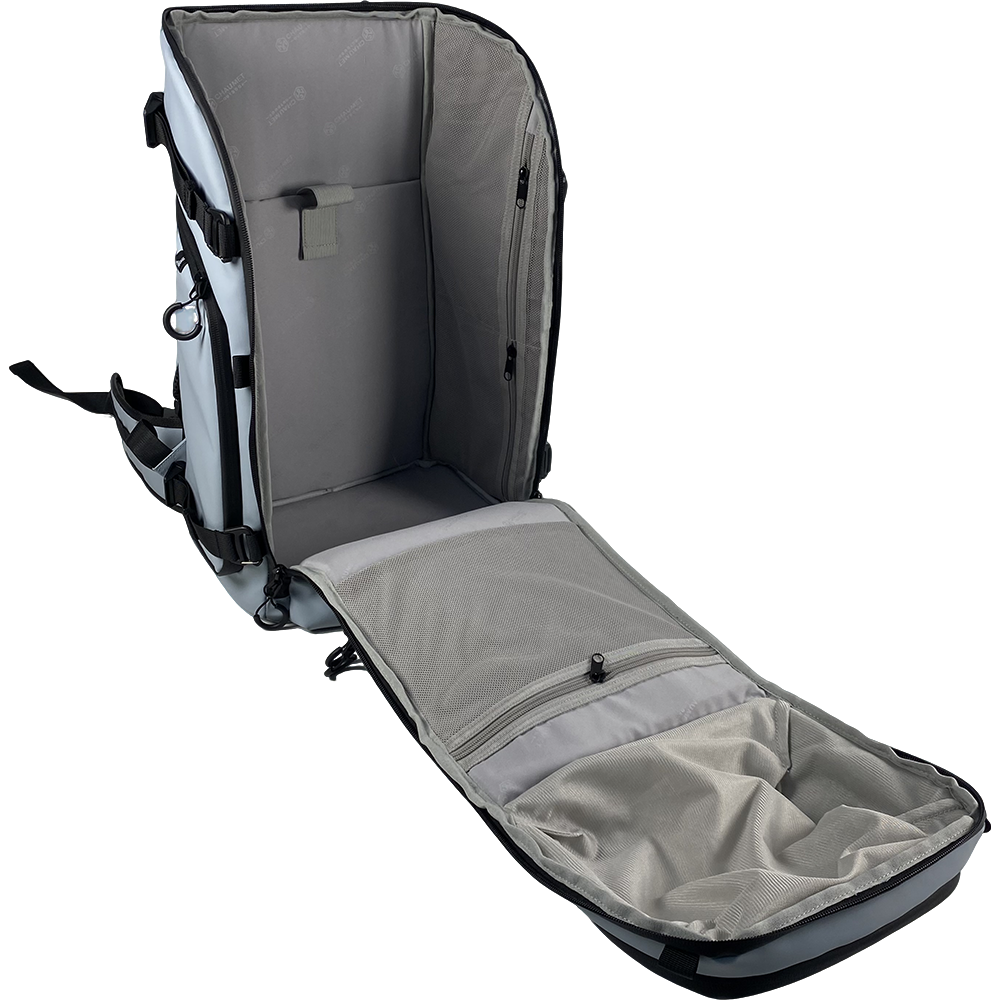 securely hold your boots (up to men's size 12.5), helmet, and accessories. External adjustable webbing ensures your snowboard