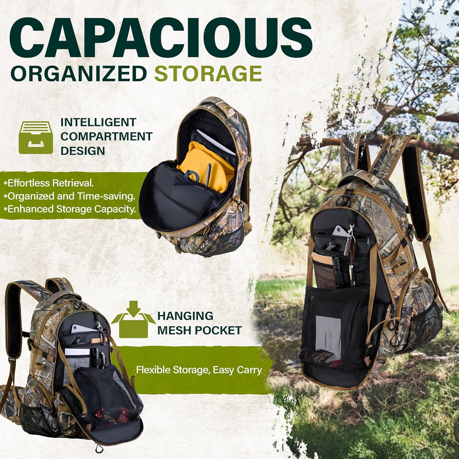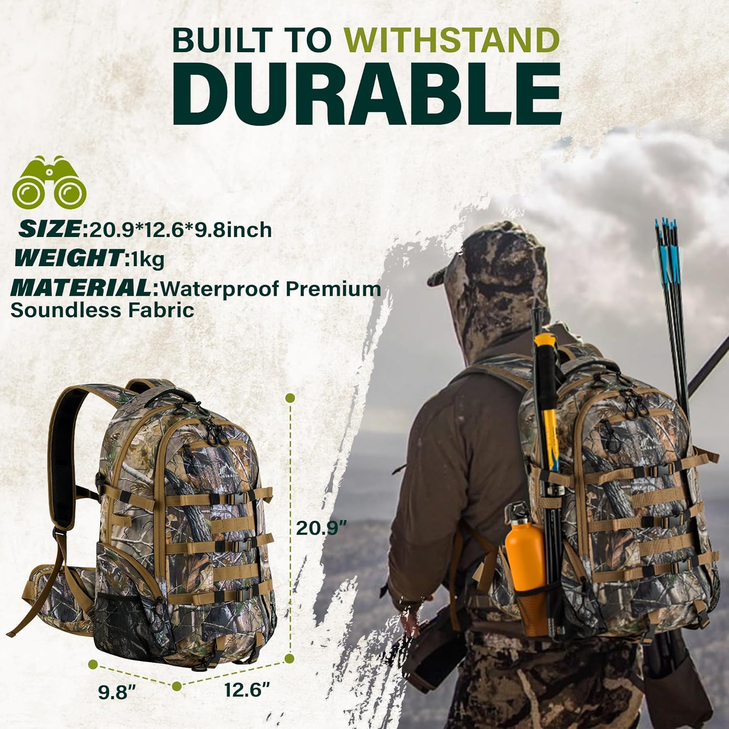 | Feature: | * 【Durable & Stealthy】 Constructed with durable 600D fabric, which is designed to resist punctures and noise, ensuring you remain undetected in the forest. The camouflage pattern provides optimal camouflage during hunting, allowing you to blend seamlessly with your surroundings. |