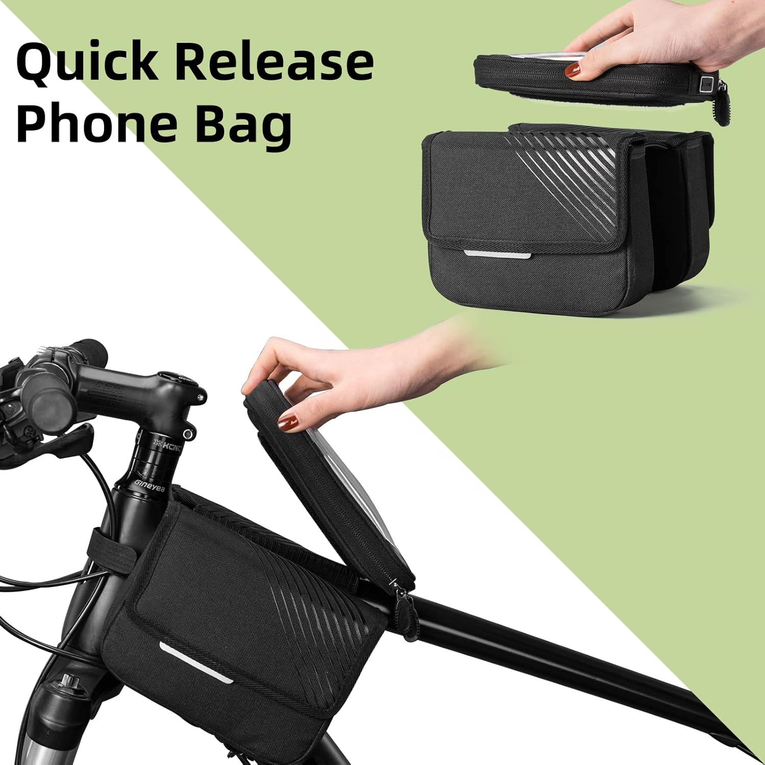 | Feature: | 1. HIGH SENSITIVE TOUCH SCREEN. The bike frame bag is designed with a high-sensitivity and clarity TPU film. While cycling, you can easily touch the phone in bike bag and view map on the phone. Head phone hole at the bottom of the bike bag let you enjoy music anytime when riding. 2. EASY TO INSTALL& QUICK RELEASE. The bike phone frame bag quick-release mounting system of the bag that allows fast, easy mounting and removing. 3. WATERPROOF&PHONE PROTECTION. This waterproof bike bag is made of sturdy material and TPU, resistant to water and dust . This bike phone pouch is equipped with a rain cover which can fully cover your top tube bike bag. The sponge inside the bag can protect your phone effectively |