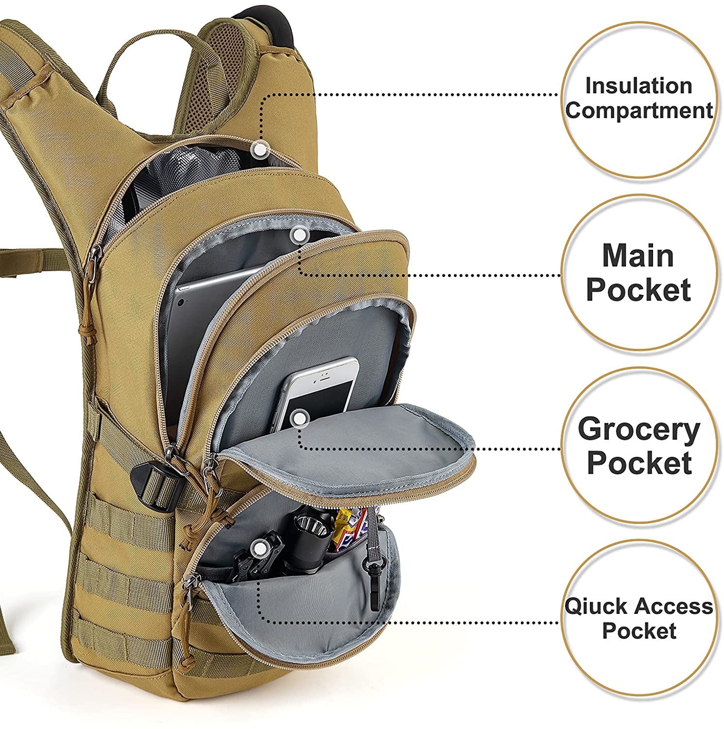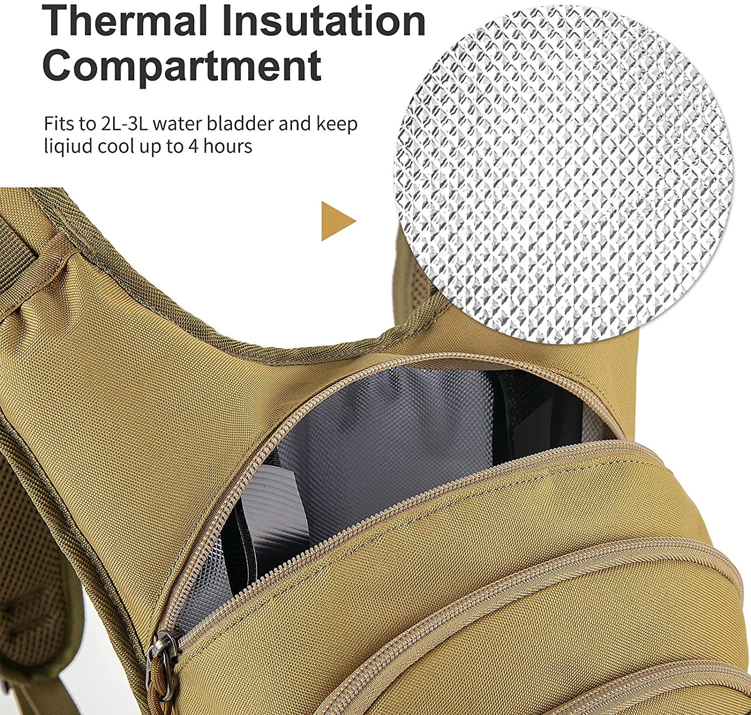 This hydration backpack has an insulated bladder compartment that holds a 2L water bladder for up to 4 hours of liquid cooling. There are two tapes on the top to ensure that the bladder does not bounce during your hiking.