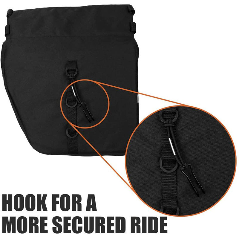 | Feature: | 1. Large zippered pockets: Panniers with large zippered pockets, reflective trim, and carrier handle on top. 2. Angled pocket design: Angled pocket design ensures pedaling space. 3. Reflective trim: This reflective trim ensures nighttime visibility. 4. Adjustable hooks fit most bicycle races: Four shelf straps and two height-adjustable bungee hooks for mounting. |