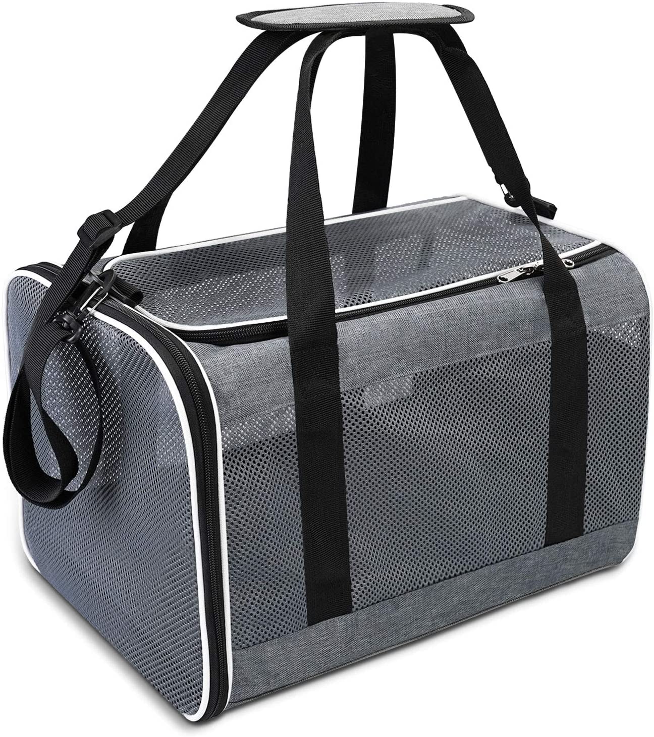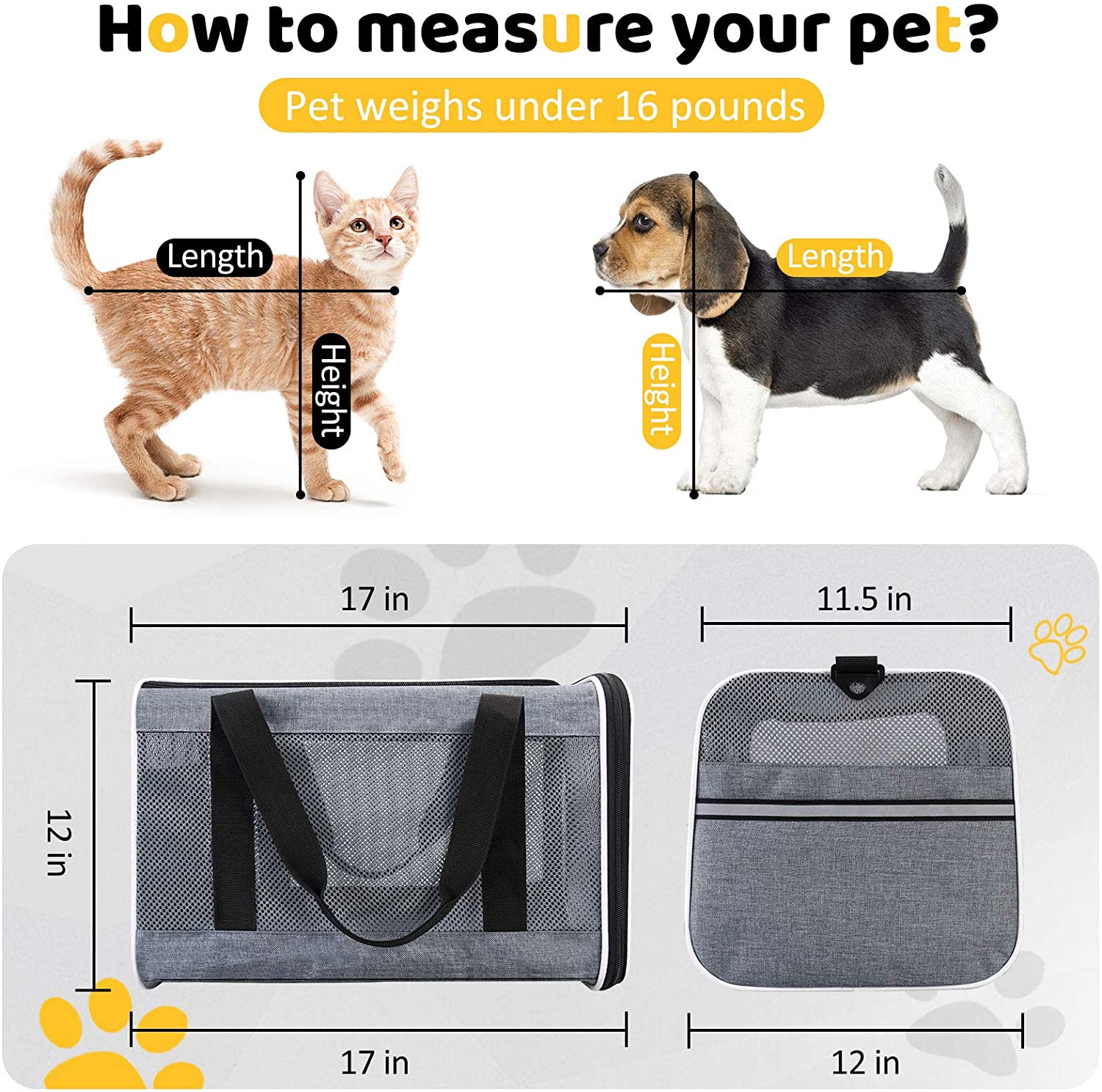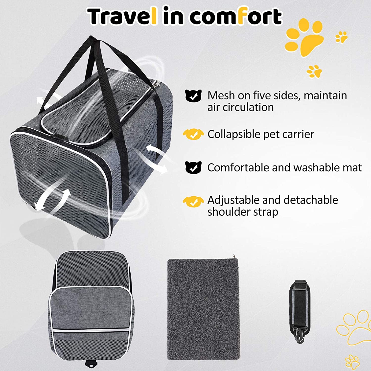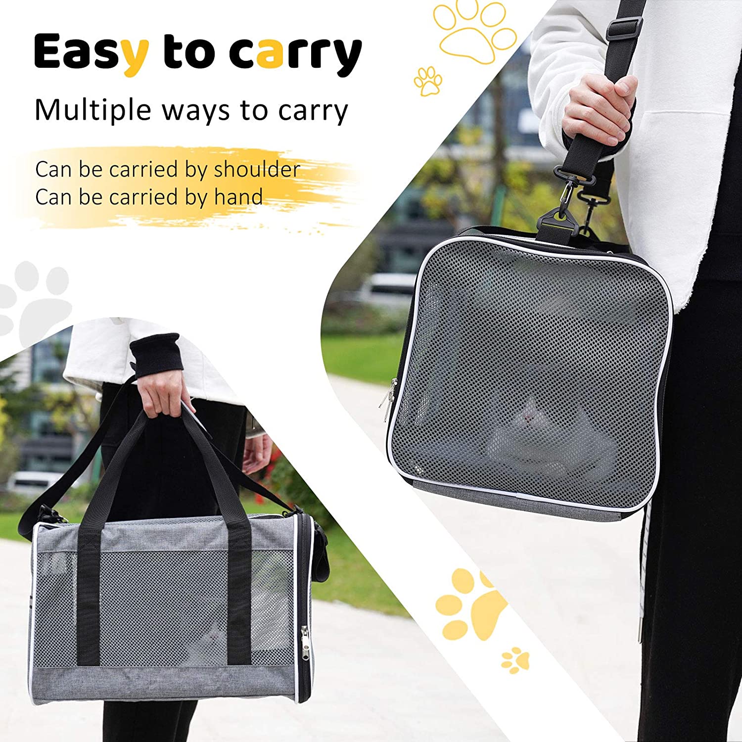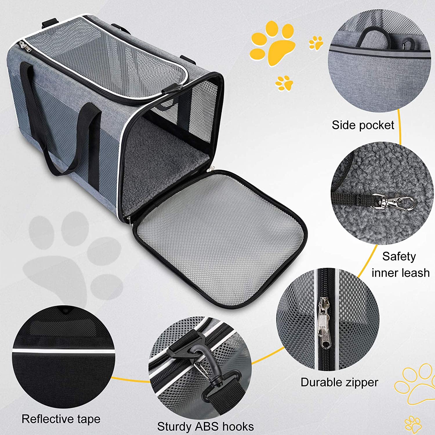 | Feature: | ---Breathable & Comfortable: Design with four mesh visual windows helping your pets breathe the fresh air, viewing scenery, and easily see you by their side, effectively reduce their anxiety. Also, allow you to keep an eye on your pets. soft pet carrier design with a removable cozy pad for your lovely cats, Which is soft, machine washable, and comfortable. ---Safe & Sturdy: With strong steel frame ensures the puppy carrier will not collapse. Also, with safe inner leash provide more safety for your pet. The 3-layer bottom pad allows your pet to stand or lie down on a flat space, also provides more balance for your pet. Two sides of bottom pad design for warm or cold use. |