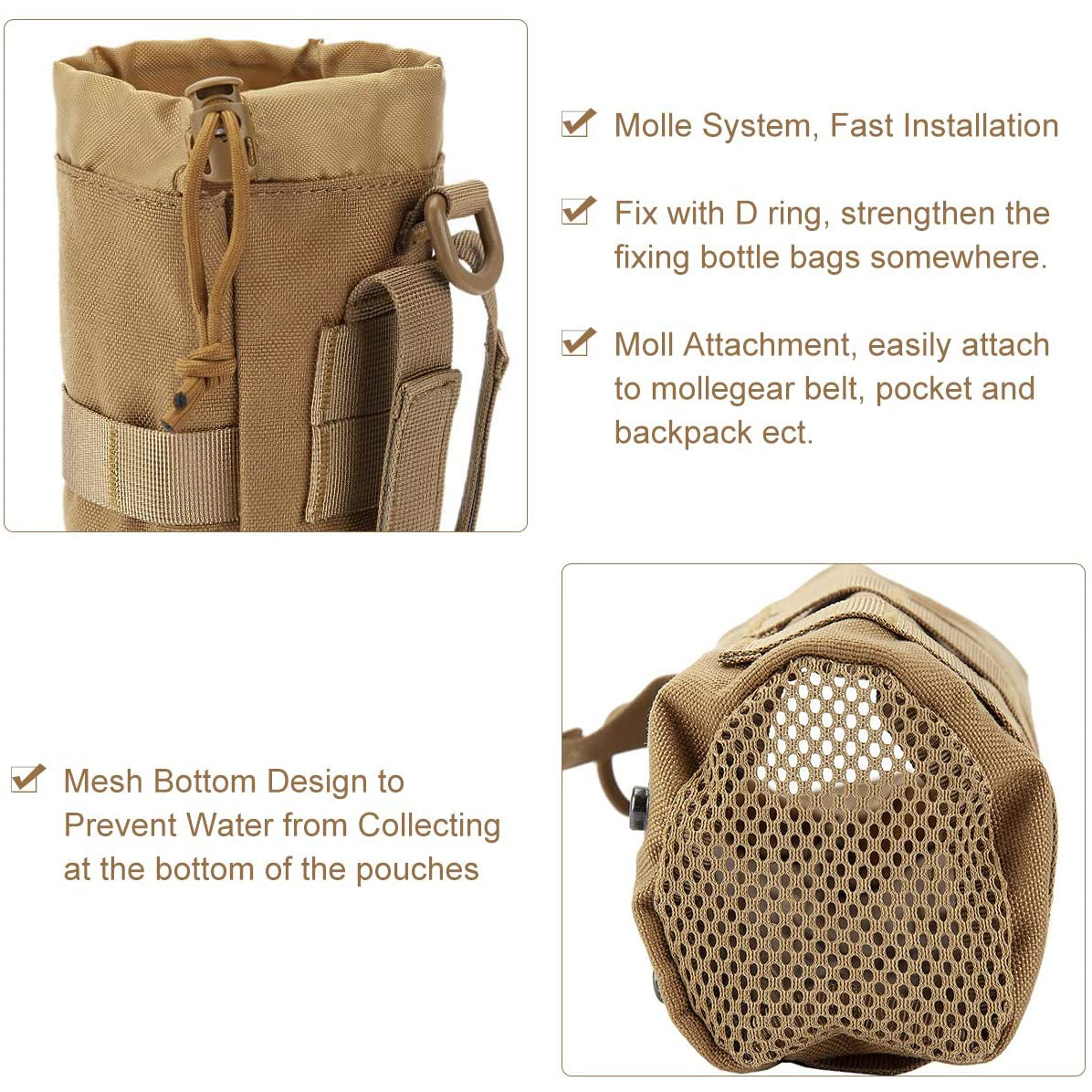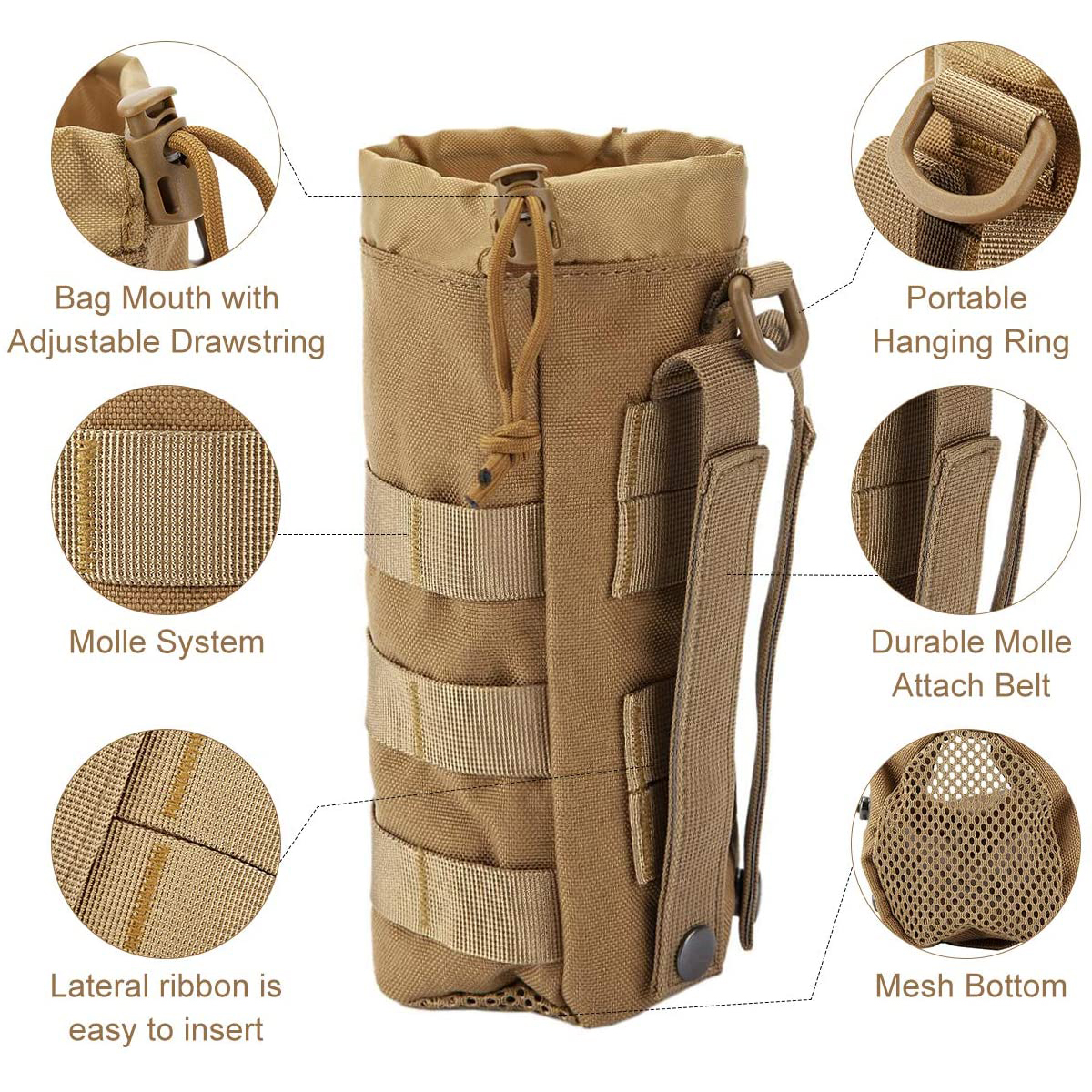 | Description: | Drawstring Molle Water Bottle Holder with Mesh Bottom for Outdoor Sports Tactical Hydration Carrier Bag |
