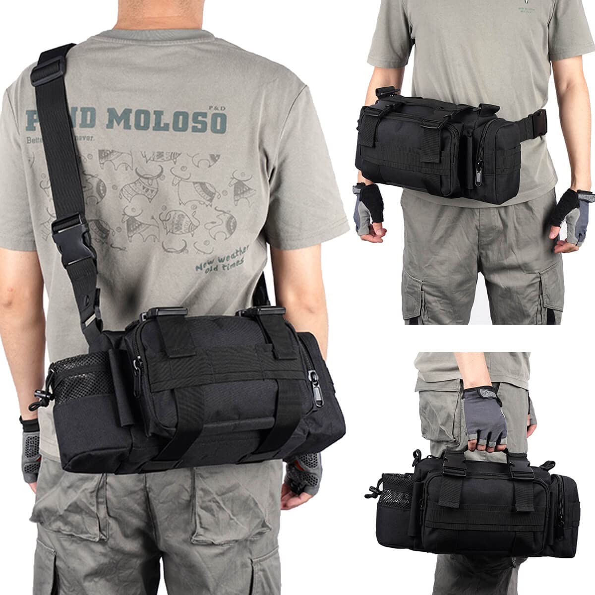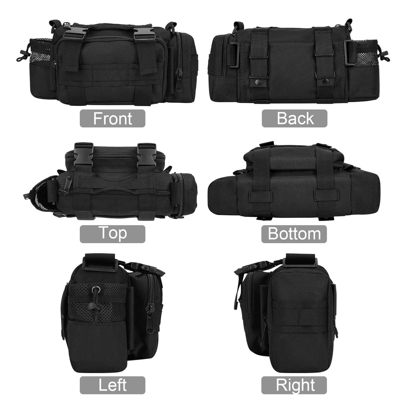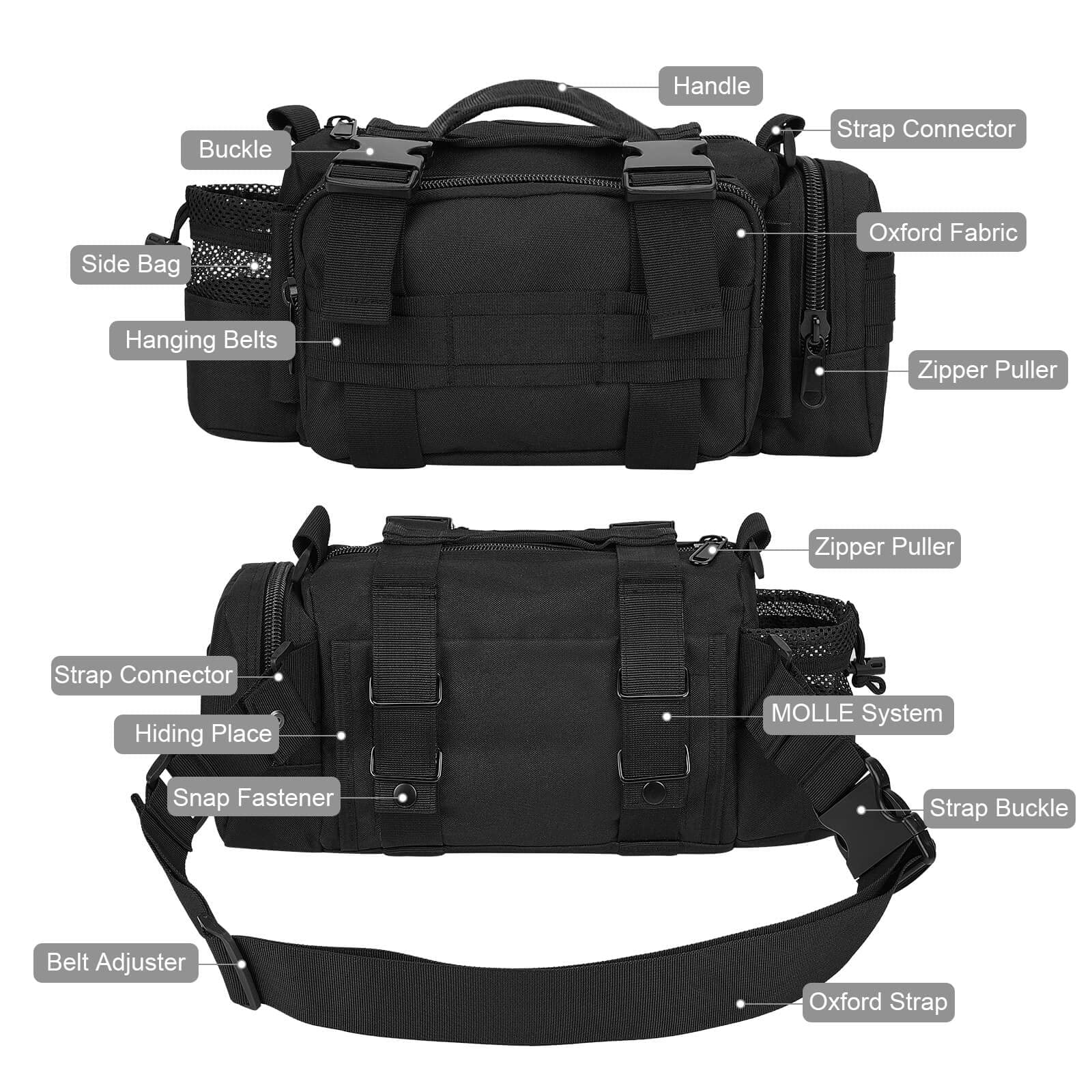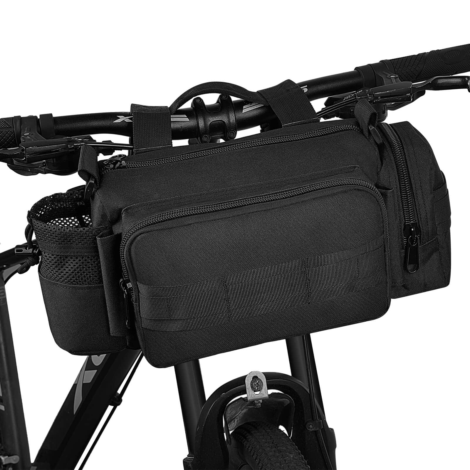 | Feature: | 1. Multi-purpose Bike Handlebar Bag - Multi-purpose handlebar bag with adjustable strap can also be used as bike top tube bag, shoulder bag, waist bag and messenger bag. Hang it on handlebar as sixth image shows please. 2. 600D Polyester and Water Resistant Materials - Made of real 600D Polyester and inner PU water resistant layer, so this heavy-duty pack is scratch resistant, anti-abrasive, colorfast, rust resistant, and it is reinforced at all stress points. 3. Bag with MOLLE system - This expandable bag has MOLLE attachments on its back, and allow you to attach it to Duty Utility Belt, Admin Bag, backpacks, PALS Vest or any MOLLE compatible gears. |