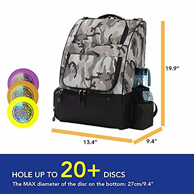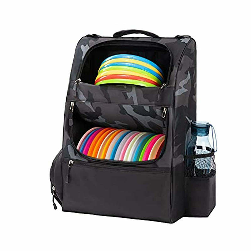| Feature: | 1.Holds up to 20+ discs easily in the main compartment. 2.On the upper compartment for at least 4 discs. 3.A front-facing pocket for pencils, scorecards, mini discs. 4.2 side pockets for drink bottles, towels, keys, your belongings and more. 5.600D polyester fabric with adjustable straps for a comfortable carry Our disc golf bag with lots of storage for discs and accessories provides a great experience on any disc golf course. |