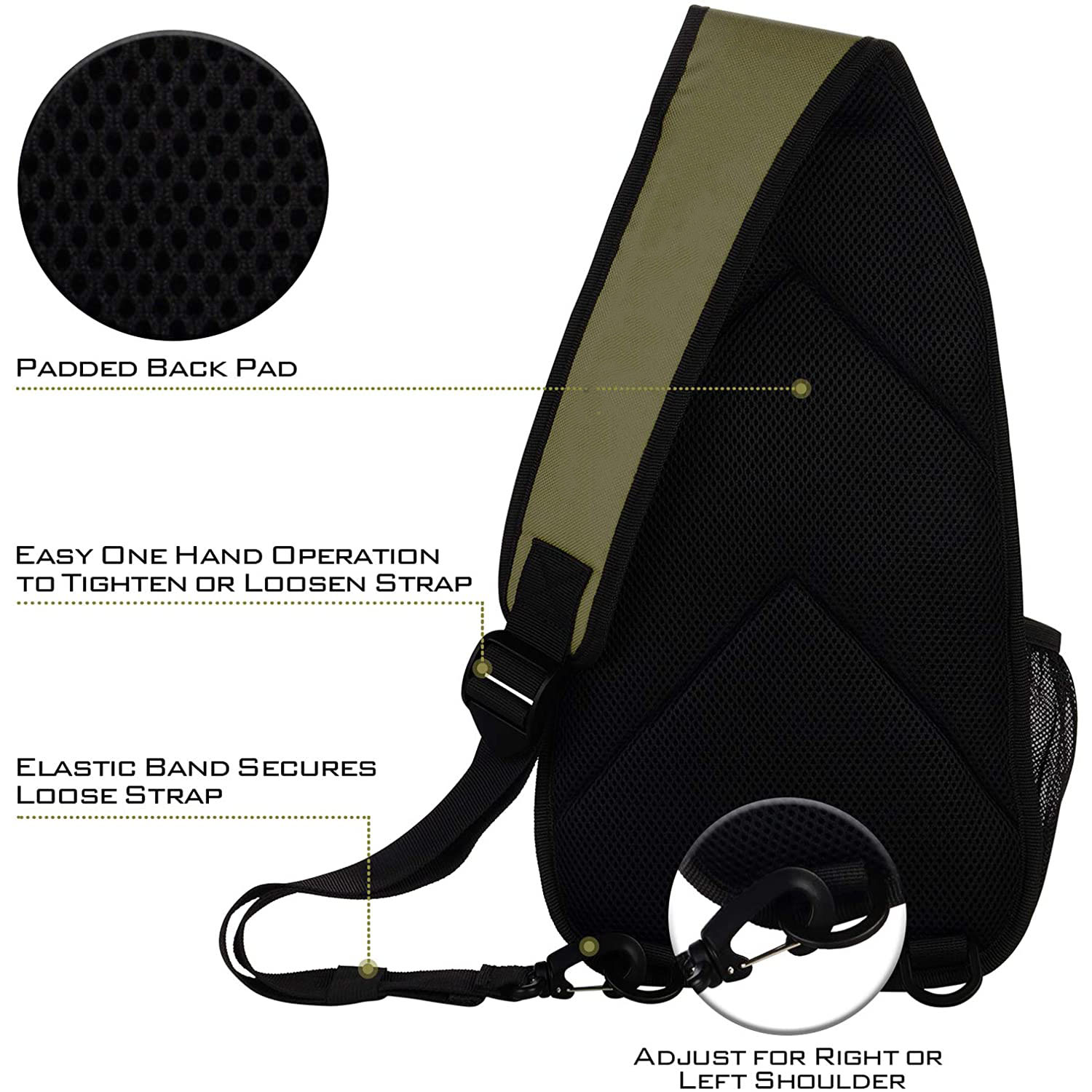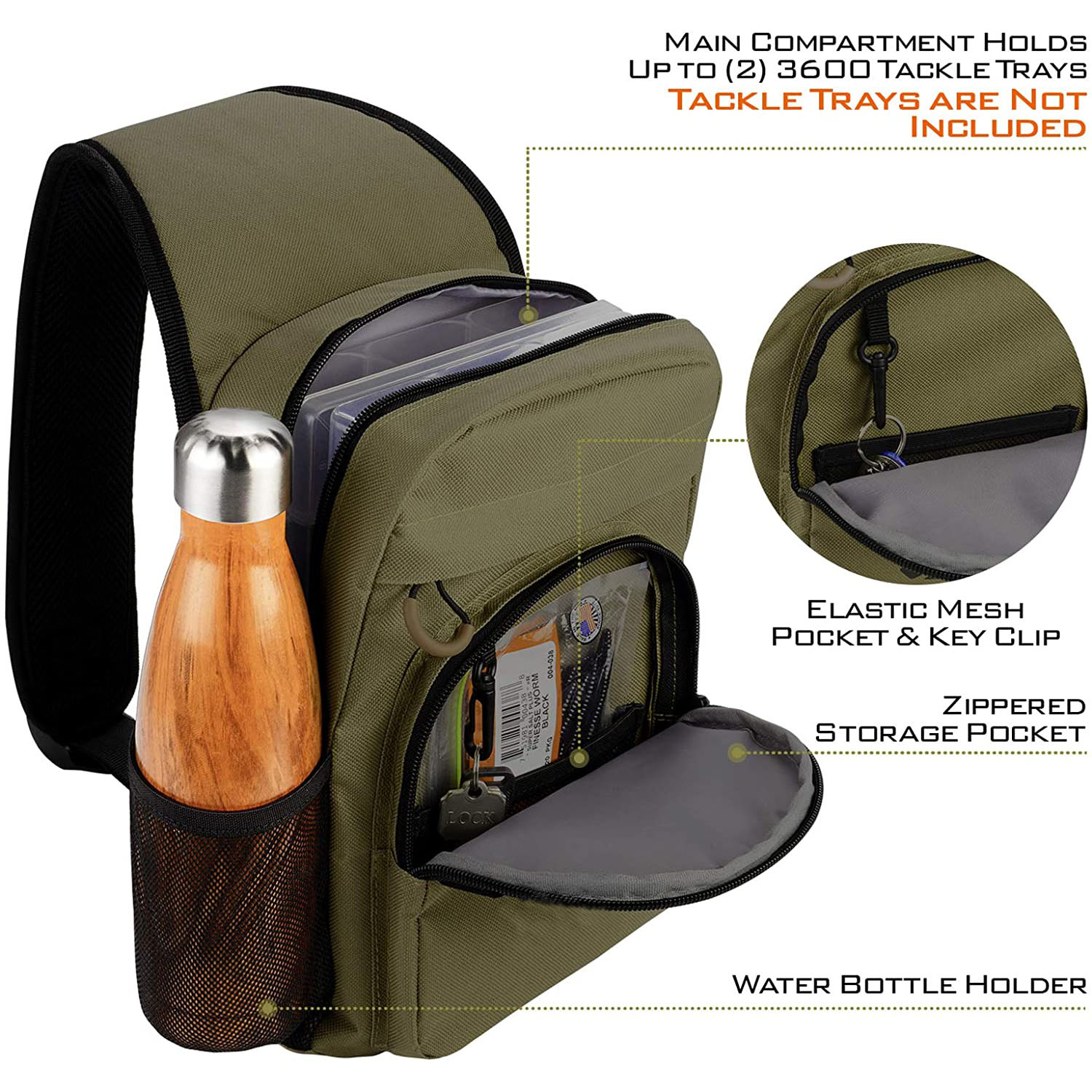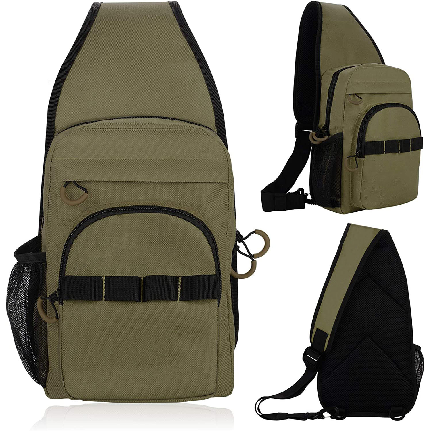 | Feature: | 1.VERSATILE DESIGN - This lightweight, versatile sling style shoulder bag helps to organize essential gear for fishing, hiking, biking, hunting, canoeing, kayaking, or as a sling school bag. The single straps permit the bag to comfortably rest in the middle of your back and provide easy access by simply rotating the bag to the front. Adjust the shoulder strap length and attach to the right or left side based on your preference. 2.FUNCTIONAL DESIGN – Front-mounted molle straps work great to attach pliers, line clippers, leader line, Bluetooth speaker, or other gear. Loop zipper pulls offer quick and easy one-finger operation, and a padded back pad helps to cushion the load for a comfortable journey. An integrated key clip ensures your keys will not get lost. |