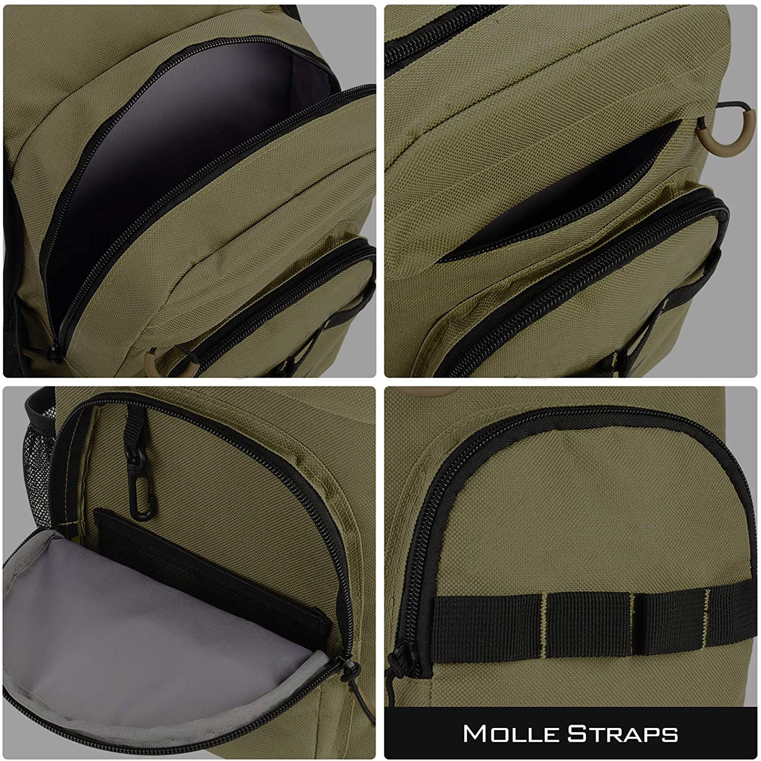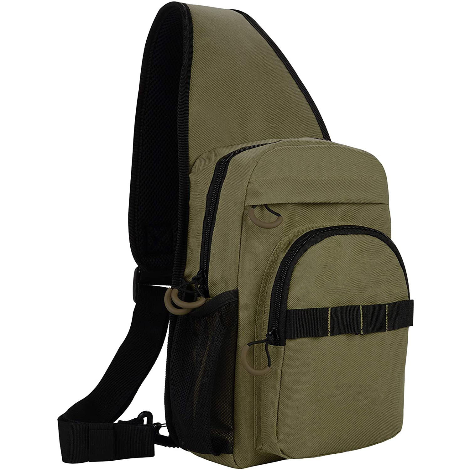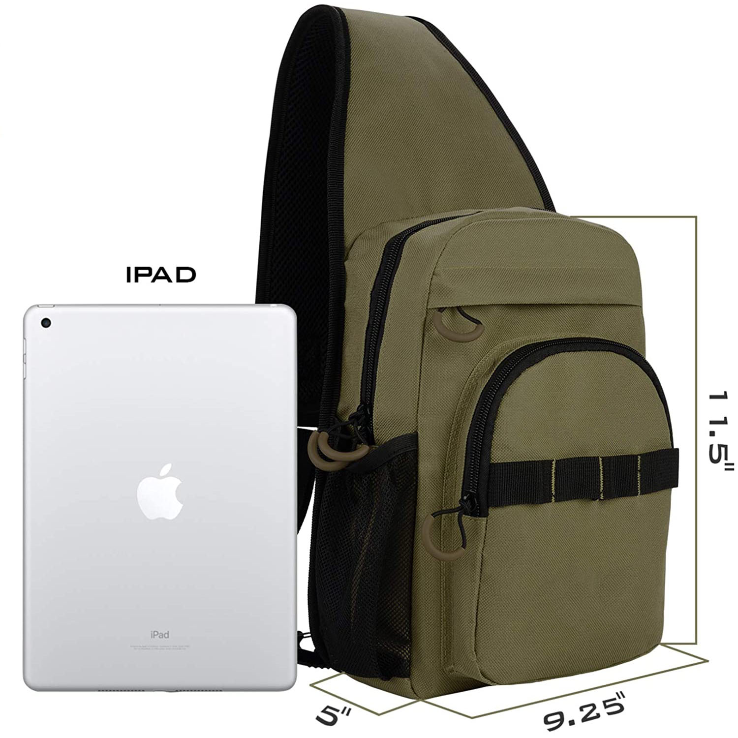 | Feature: | 1.VERSATILE DESIGN - This lightweight, versatile sling style shoulder bag helps to organize essential gear for fishing, hiking, biking, hunting, canoeing, kayaking, or as a sling school bag. The single straps permit the bag to comfortably rest in the middle of your back and provide easy access by simply rotating the bag to the front. Adjust the shoulder strap length and attach to the right or left side based on your preference. 2.FUNCTIONAL DESIGN – Front-mounted molle straps work great to attach pliers, line clippers, leader line, Bluetooth speaker, or other gear. Loop zipper pulls offer quick and easy one-finger operation, and a padded back pad helps to cushion the load for a comfortable journey. An integrated key clip ensures your keys will not get lost. |