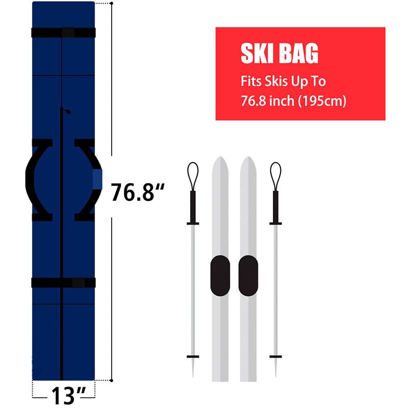 | Feature: | 1. BE READY FOR ANY WEATHER WITH 600D WATERPROOF FABRIC: Waterproof and wear-resistant nylon fabric will ensure years of use in any weather conditions. 2. ERGONOMIC HANDLES AND SMOOTH ZIPPER: Comfortable, ergonomic carrying handles make carrying your skis a breeze. Enjoy great details that are made to last! 3. ADJUST LENGTH OF SKI BA: Roll up the top of the bag and fix for a snug fit for shorter skis. |