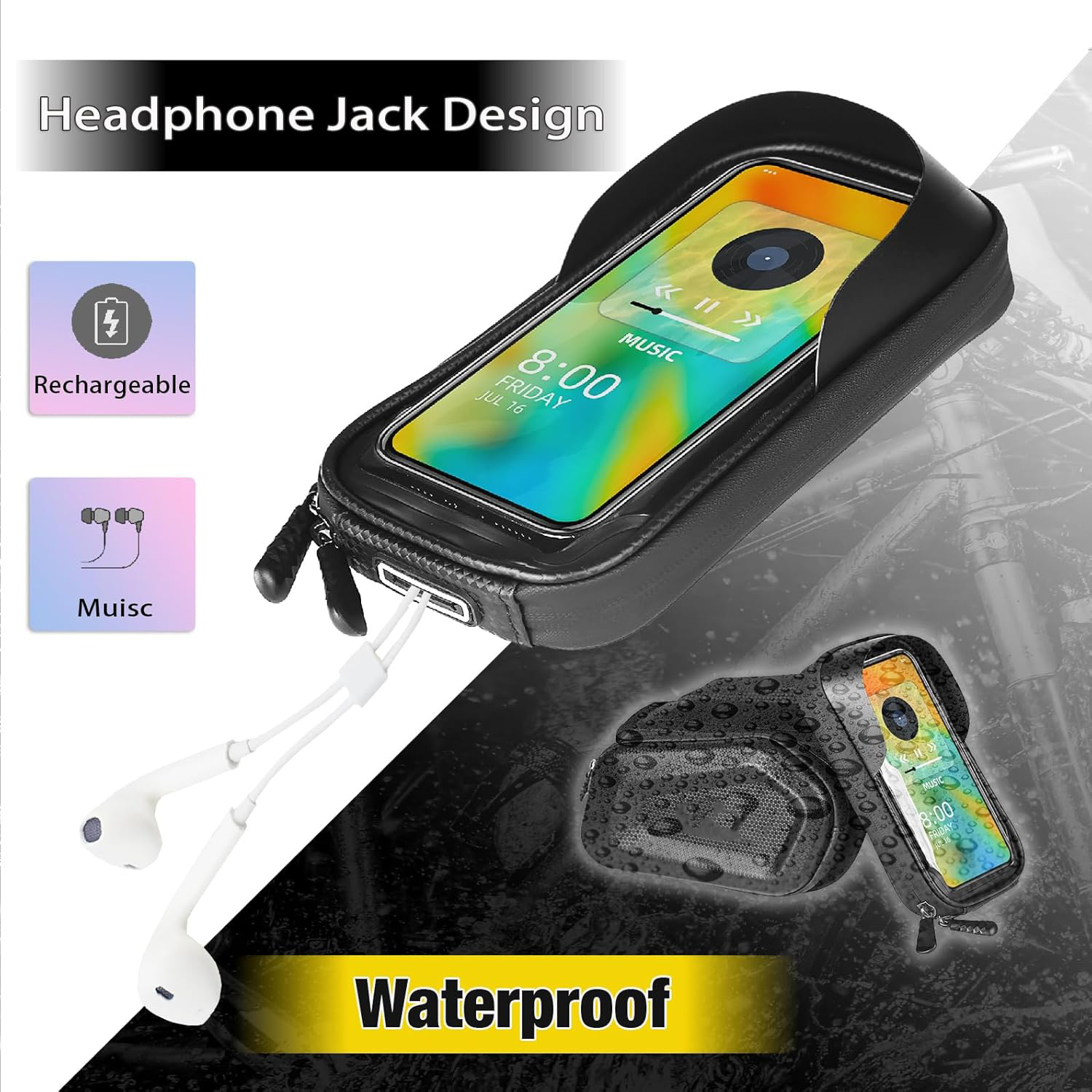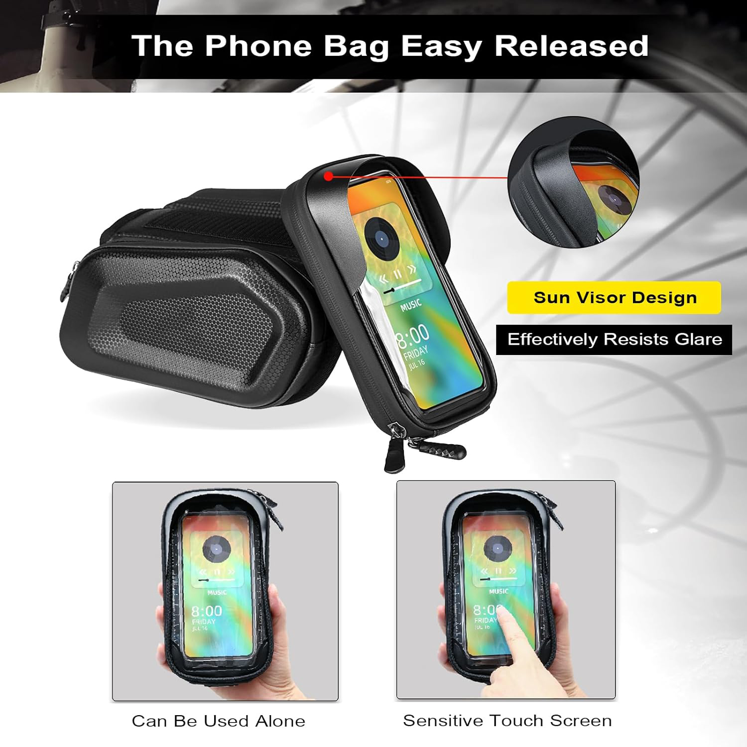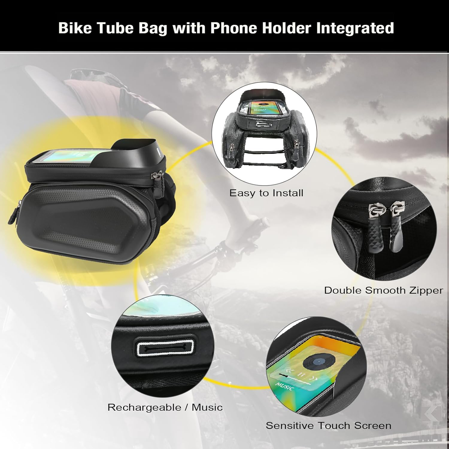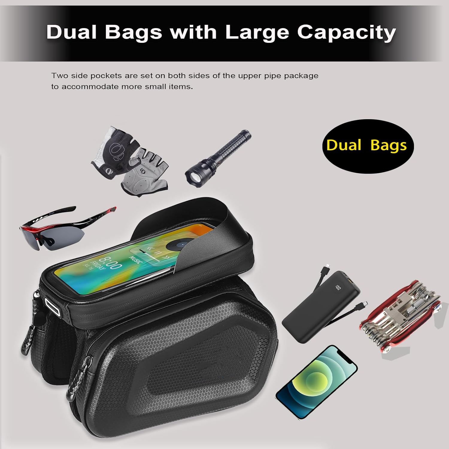 The bicycle front frame Tube bag with cell phone mount bag is made of high quality PU material and touchable TPU material phone bag offer a comprehensive protection for your cycling accessories inside, Unique waterproof glue zippers in double sides will keep your belongings dry in rainy days.