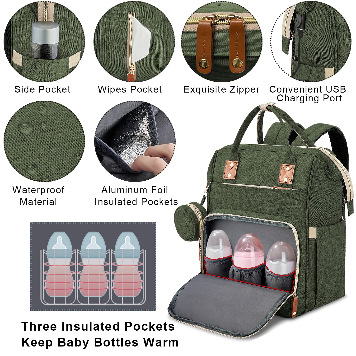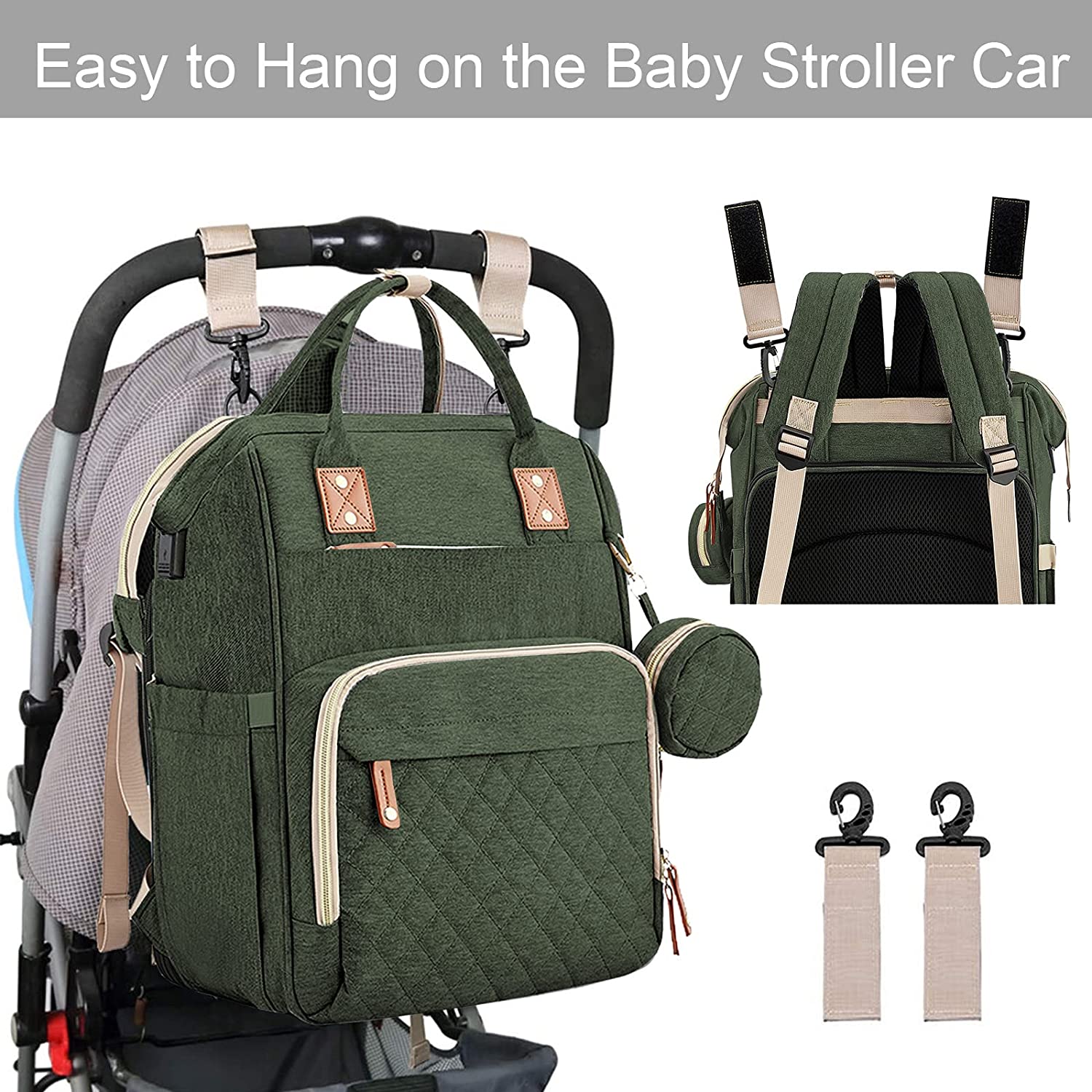 | Feature: | Convenient, Lightweight and Comfortable to Carry: Built with USB Charging Port to recharge your cell phone, 2 side pockets are easy to store baby wipes on the go conveniently. Coming with special but durable stroller straps that make it easy to attach the diaper bag to the handlebar of your stroller. It can use as a backpack, a handbag also can hang on the stroller, you can leave your hands free at all times. |