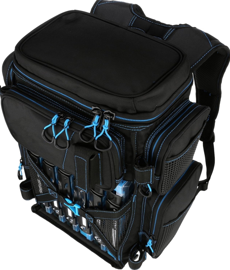 * Large Capacity - The tackle bag has a very large capacity .The large main compartment with removable divider,converts backpack for storage of larger items.Two front zipper pockets, four zippered side pockets,two mesh pocket and waist pack provide additional carrying and plenty of extra storage for accessories