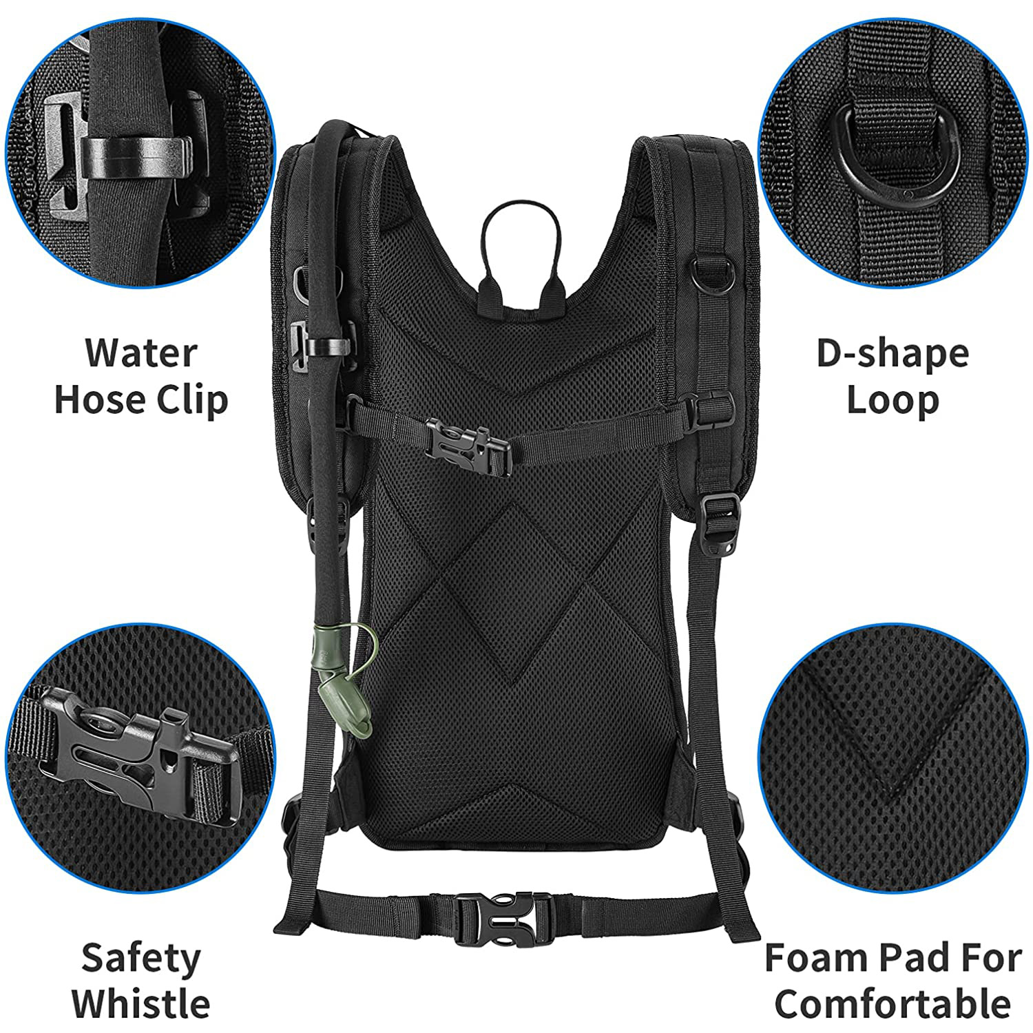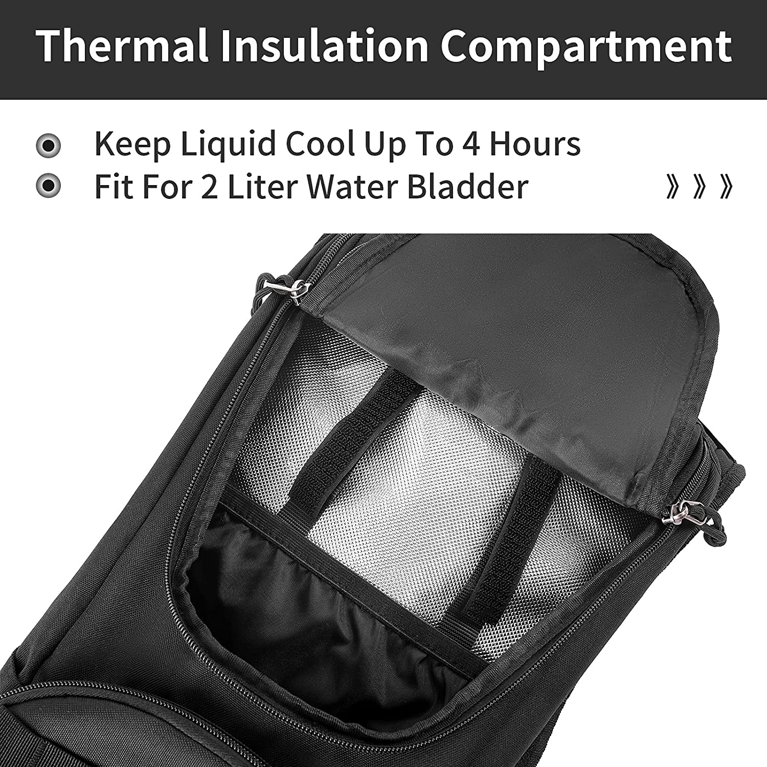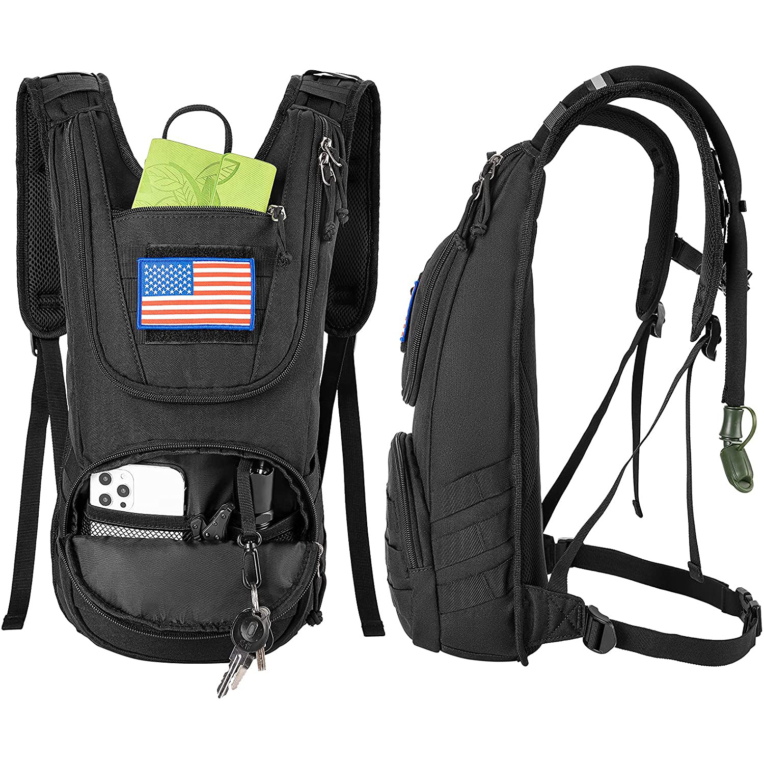 | Feature: | 1.Multi-compartment with Molle System: The main compartment is roomy enough to carry water bladder, iPad and lunch box. Two front zipper pockets are perfect for storing wallet, phone, keys, small first-aid kits, sunscreen, gloves, multi-tool, etc. The Molle system allows you to attach other gears to the pack. 2.Insulation Layer & Water Bladder: Insulated hydration layer can hold for 4 hours, with BPA-Free Leak-Proof 2L hydration bladder, free your hands and can meet the need for drinking water for one-day hiking. |