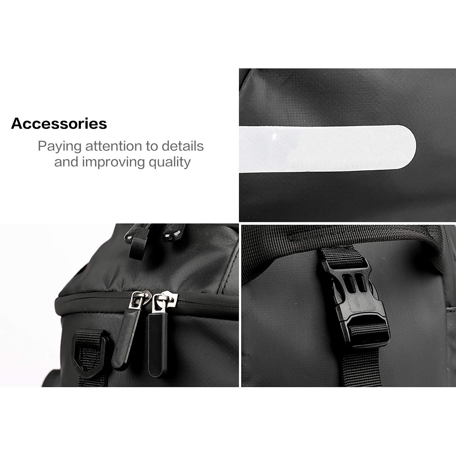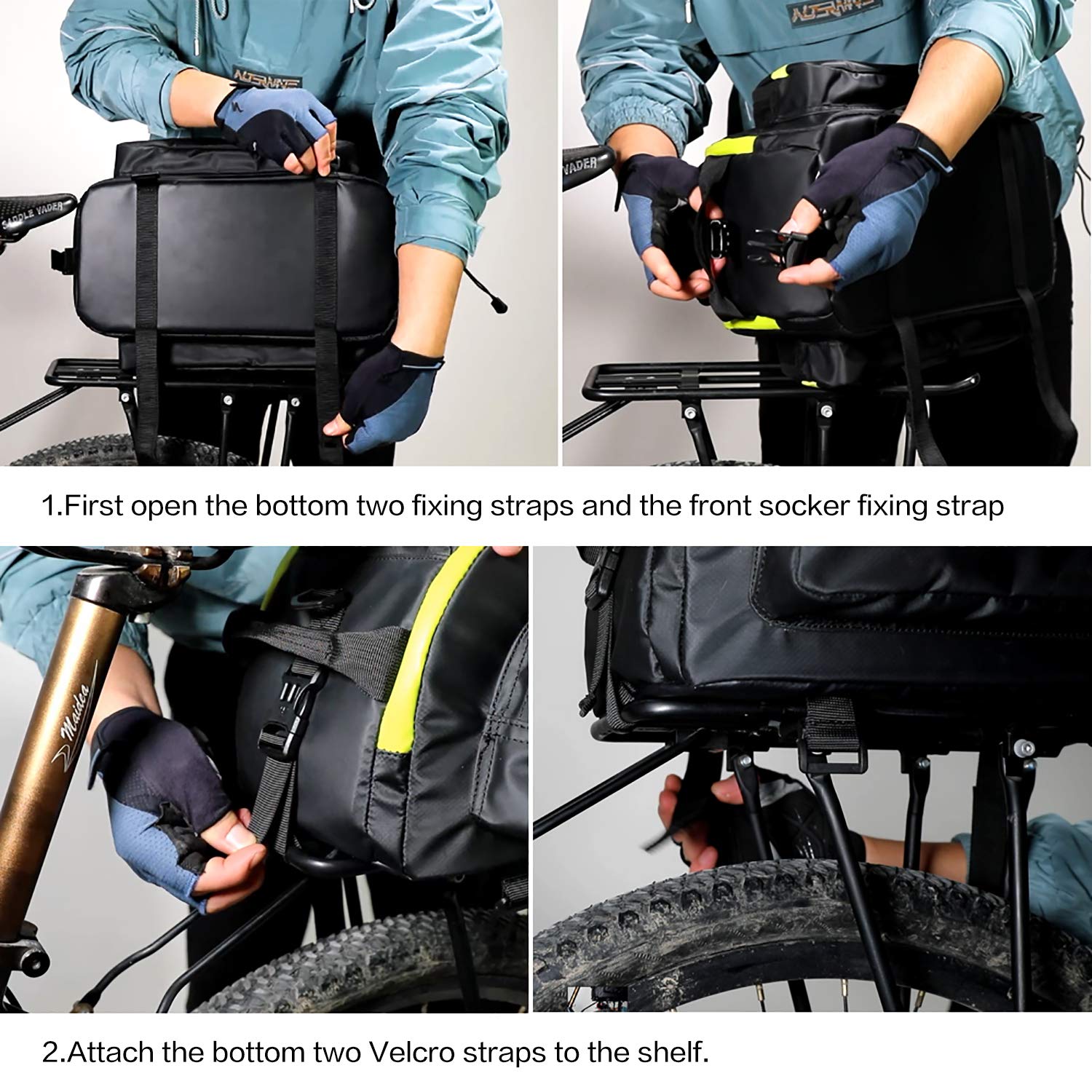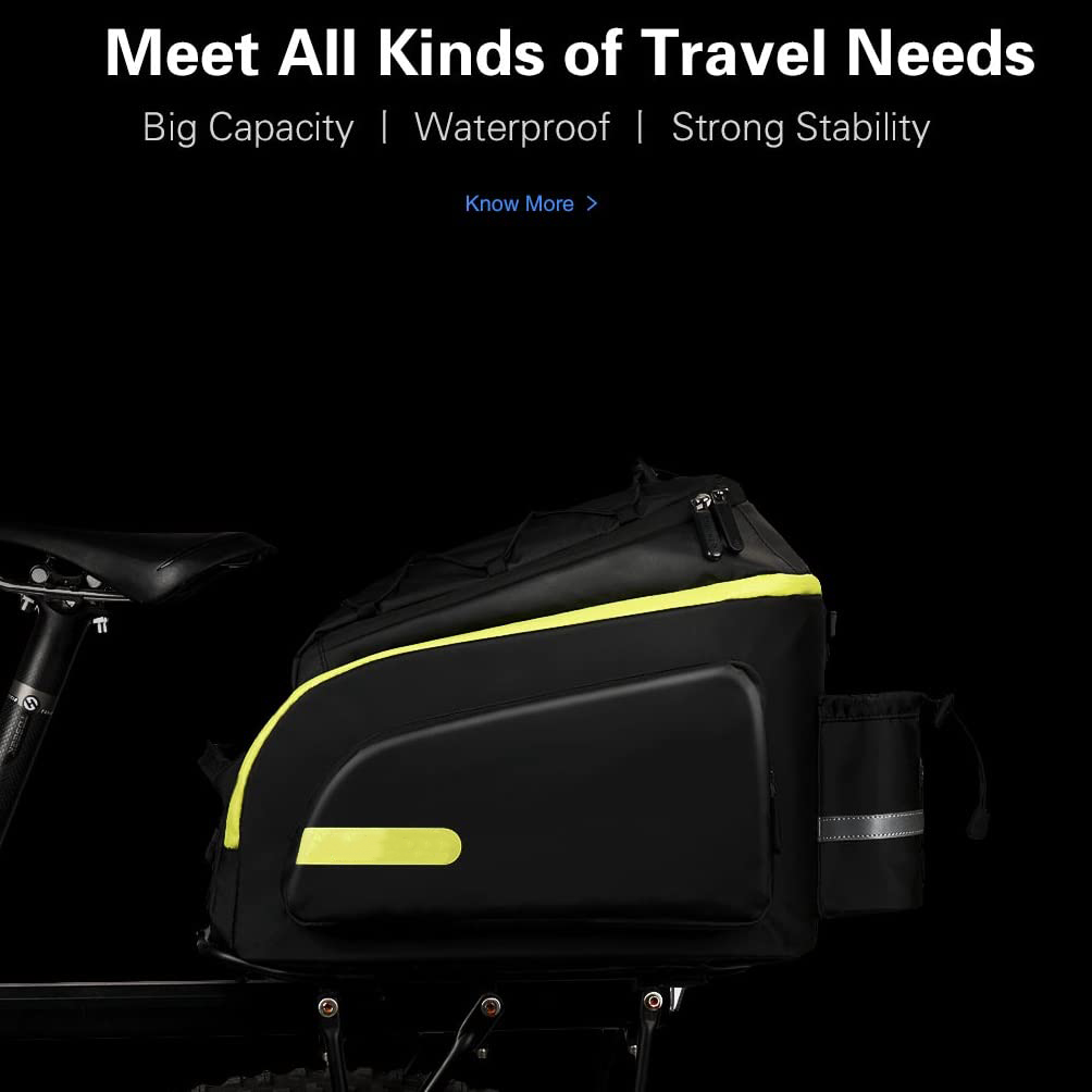 | Feature: | Waterproof Function. Made of 600D polyester material with waterproof PVC layer on both sides, this bike pannier is super durable and fully waterproof, as well as anti-tear, wear resistant and heat resisting, protecting your items perfectly. 17L Capacity. Bike Trunk Bag size: 39*19*29 cm/15.3*7.4*11.4 inch, up to 17L capacity, fully expanded to hold more.Easily store water bottles(No side bags), pumps, shoes, gloves, wallets, clothing, energy bars, etc. Bike Rear Seat Rack Pannier Easy Installation. Quick release system, easy to be fixed on rear seat trunk rack and carrying handle for portable. |