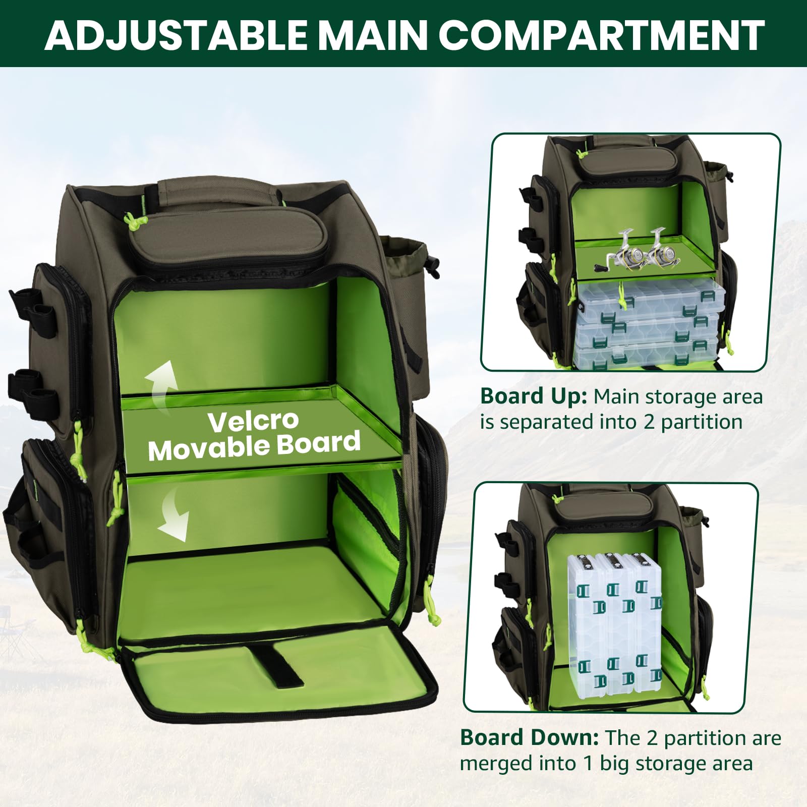 * Large Capacity - The tackle bag has a very large capacity .The large main compartment with removable divider,converts backpack for storage of larger items.Two front zipper pockets, four zippered side pockets,two mesh pocket and waist pack provide additional carrying and plenty of extra storage for accessories