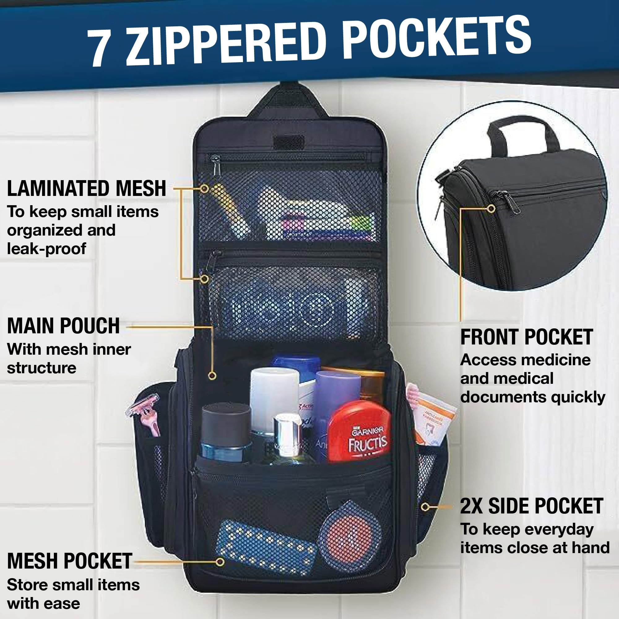Convenient Hanging Hook: The XXL metal swivel hook allows you to hang the bag anywhere, saving valuable counter space. It's perfect for use in hotels, bathrooms, or even on a camping trip.
