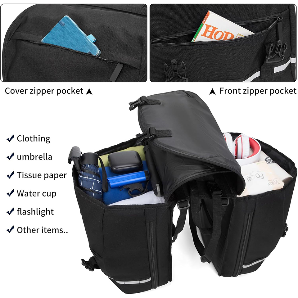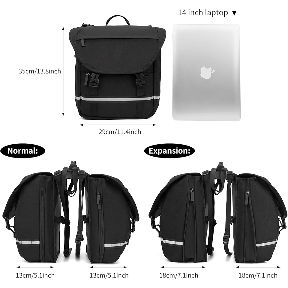 | Feature: | * Stylish Design bike rear rack bag to Meet Multiple Use Needs, More Pockets and 37L Large Capacity. Even a 14-inch notebook can be easily placed. Up to 35 KG loading weight capacity. * Waterproof Material with Extra Rain Cover. High density reinforced polyester with PU coating.Bike bag A variety of details designed to better meet the outdoor needs of bike panniers bag. Anti sludge, waterproof and rainproof. * Top bundle belt on the pannier bag allow more space for extra trunk bags on top or backpack, tent, sleeping bag and so on. Please Install it Together with a Bicycle Touring Carrier , with Fender Board, Frame-Mounted for Heavier Top & Side Loads, to Away From the Bicycle Spokes. Note: This pannier bag,rear bike bag,need your bike rear rack with support braces that overlay the tires. * Quick install and release: tool free installation with Velcro straps. bike bags frame,Compatible with the most bicycles, such as mountain bikes, road bikes and commuter bike |