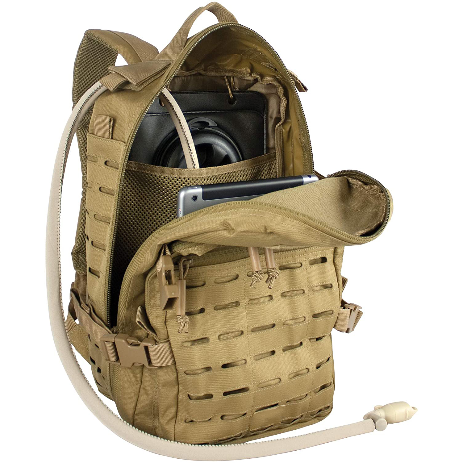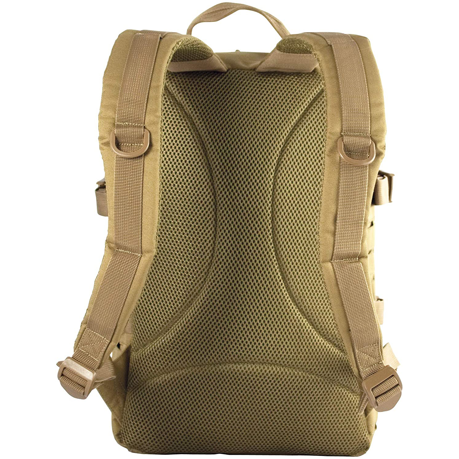 Laser-cut MOLLE webbing platform for attaching additional pouches or gear. Reinforced carry handle; Four quick-release compression straps. Mesh ventilated padded back panel with fully adjustable, contoured and padded shoulder straps. Hydration bladder compatible.