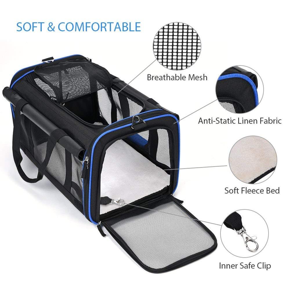 | Feature: | -- [pet travel wheels carrier] smooth & silent swivel wheels ensures smooth-rolling mobility in any direction, your pet won’t even feel a bump in it; with the extending handle, you can take your pet anywhere easily · [designed for pet’s comfort] breathable mesh on all sides ensures good ventilation and great visual-ability, roll-up flap on both sides for ultimate privacy; your pet will stay clean & ultimate comfort on the soft fleece mat during the journey · [tough & durable] tear-resistant mesh is strong enough to withstand scratches, ensures the wheels travel carrier of superior durability; no-slip carrying strap and sturdy zippers for safety · [easy storage] the four-wheeled platform is detachable, and the whole carrier can be folded completely flat for convenient storage when you’re finished traveling; removable fleece bed for easy wash |