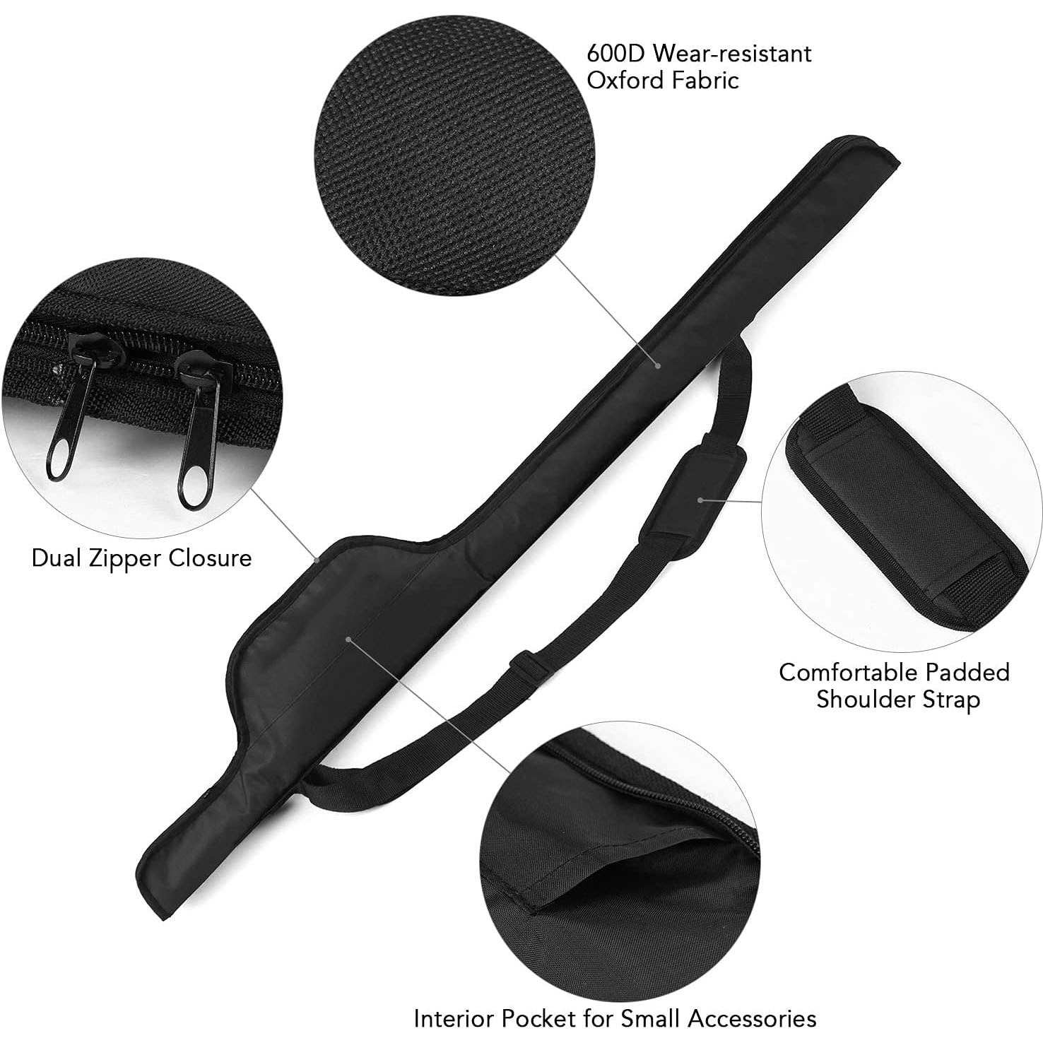 The fishing rod bag is features 600D Polyester fabric, large opening and adjustable shoulder strap, bringing you wonderful fishing experience. It is lightweight and foldable for convenient carrying.