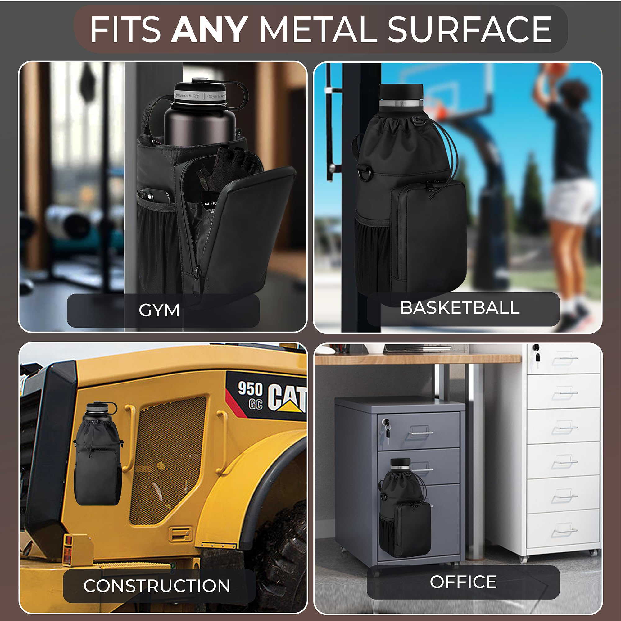 | Feature: | PATENT PENDING DESIGN. A Smarter, Cleaner Way to Workout. UNIVERSAL Fit. Holds up to 46 Ounce Bottles LARGE Accessible. LARGE Accessible Storage. Large front zipper allows for spacious, convenient storage during your workout All-Purpose Gym Bag. Works perfectly to hold ALL of your gym essentials, not just bottles EXTRA Magnetic Strength. Additional Heavy Duty magnets designed to hold up to 6 pounds of your mightiest gym accessories |