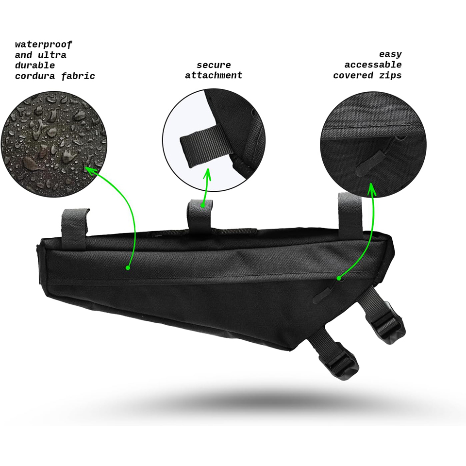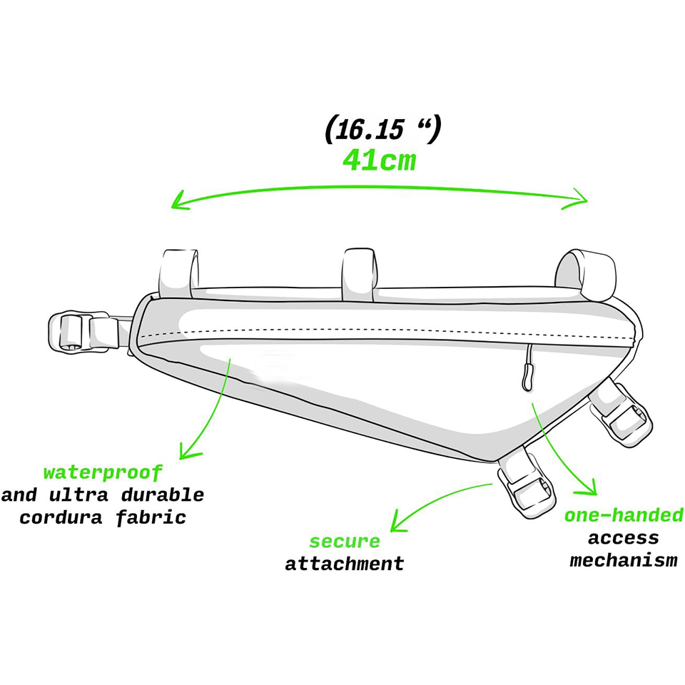| Feature: | * Durable Marvel: Crafted from Cordura 1000D fabric, this bag faces rain, mud, and challenging conditions with strong durability. Together with the Cordura main outer technical fabric and YKK Aquaguard waterproof zipper, keeping your gear safe and dry. * Double Fun: Experience ultimate convenience with double-sided zippers that grant easy access to your belongings. Stay organized with interior mesh pockets, making it simple to locate your gear on the go. The hidden front outlet allows you to connect your hose, headset, and charging cables. * Gear Up: Whether you're embarking on ultra-distance rides, bike touring, bikepacking, or any other long-term cycling journey, this bag has you covered. With its spacious interior, it provides the extra storage space you need to carry all your gear comfortably. |