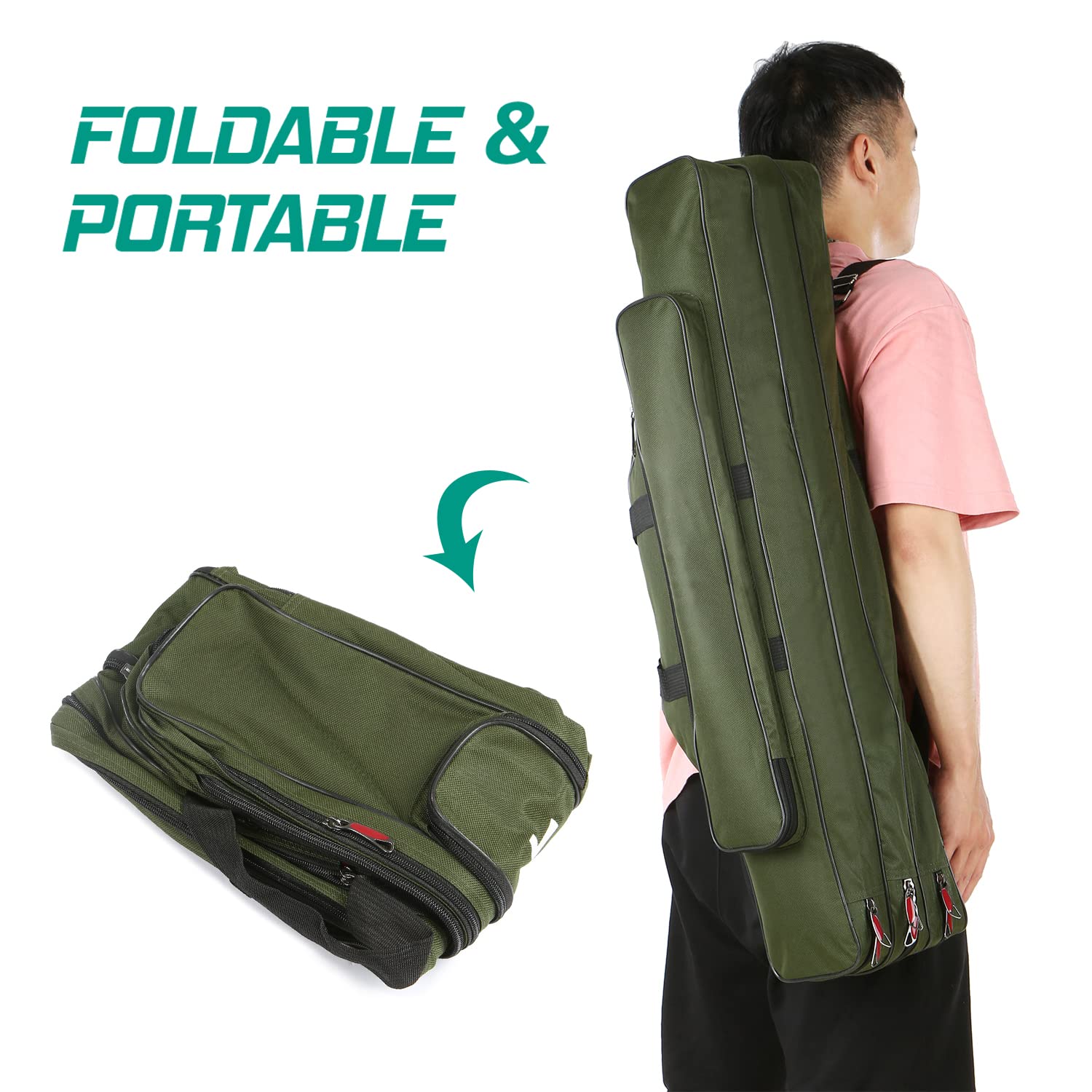 LARGE CAPACITY : The outside of the fishing bag is equipped with 5 rods and reels. When fishing outdoors, fix it with magic tape improve more convenience. The inside space of the fishing tackle bag is large. You can pack fishing tackle, multiple rods, folding chairs and more fishing equipment.