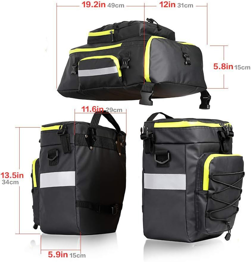 | Feature: | Made of 1000D polyester material with waterproof PVC layer on both sides, this bike pannier is super durable,as well as anti-tear, wear resistant and heat resisting, protecting your items perfectly. This 3 in 1 multifunctional bike rear pannier bag can be used independently, convenient for versatility! |